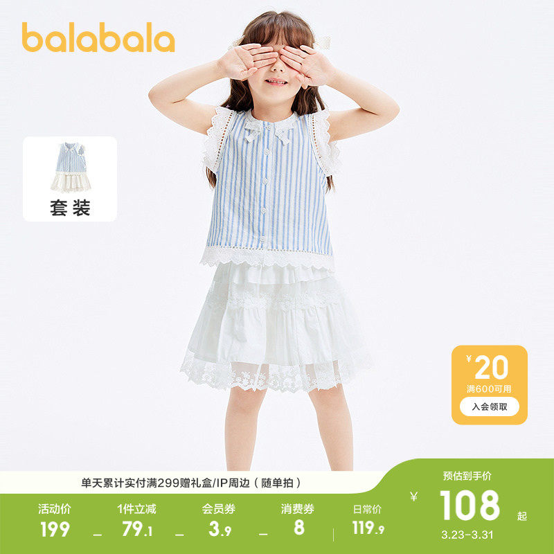 巴拉巴拉童装儿童套装女童短袖两件套2026新夏装条纹文艺蕾丝短裙