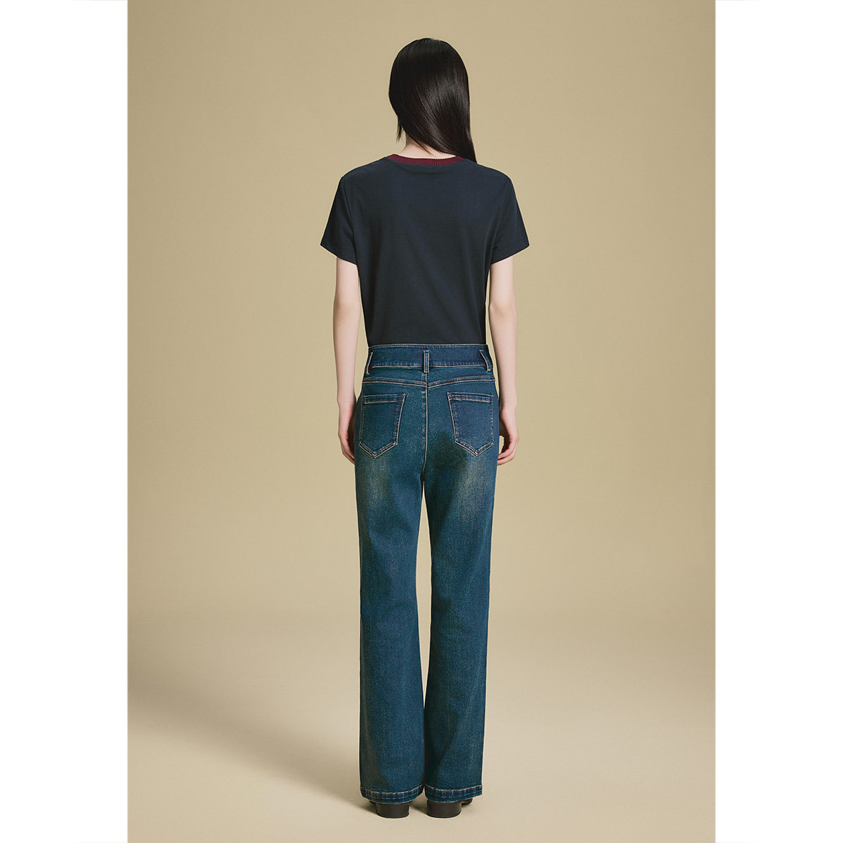 王家有鱼秋季新款2025复古蓝微喇牛仔裤中高腰不贴腿显瘦裤子女款