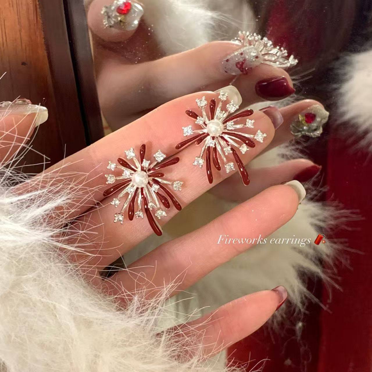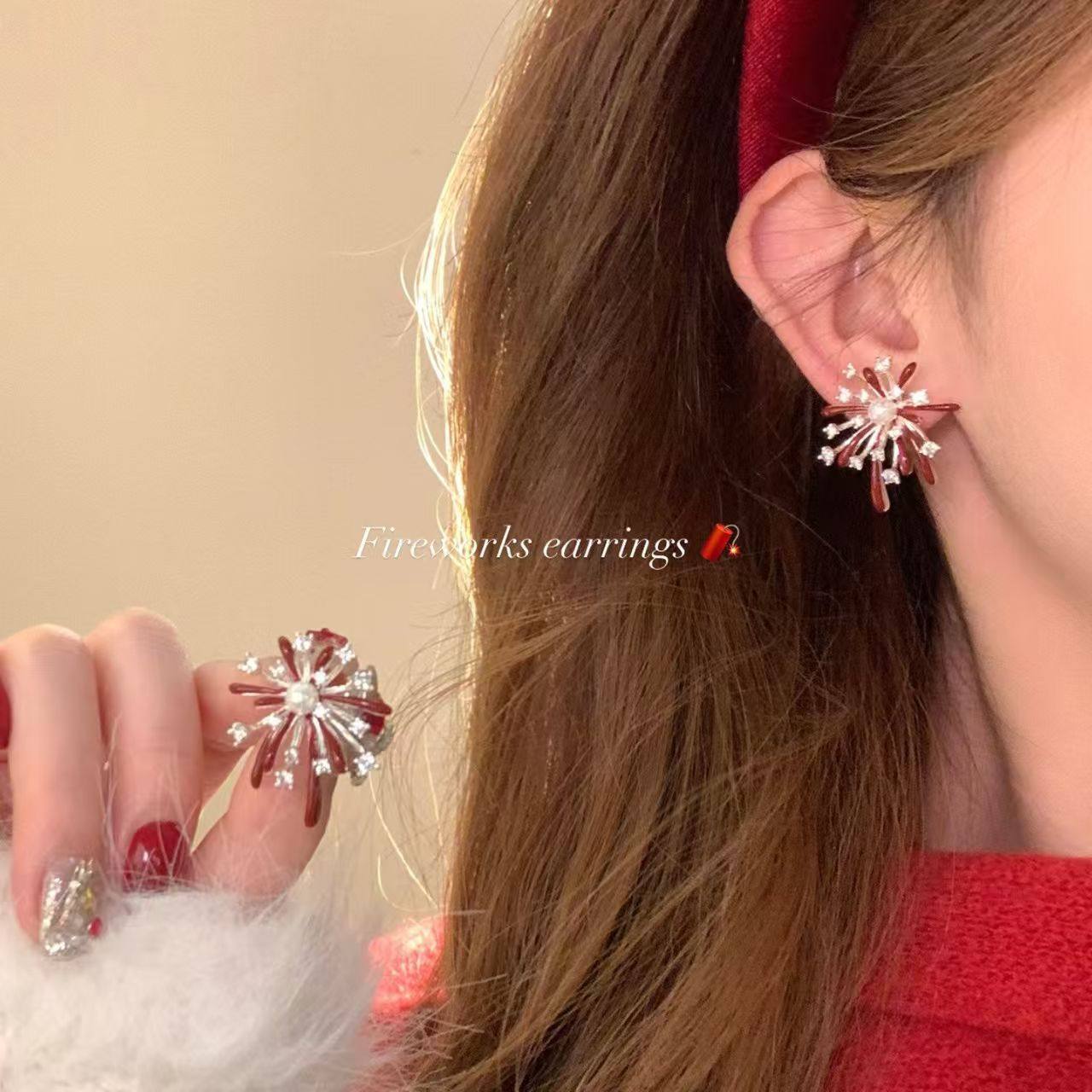 烟火~精致闪钻烟花耳钉女轻奢高级感小众设计耳环耳饰红色无耳洞