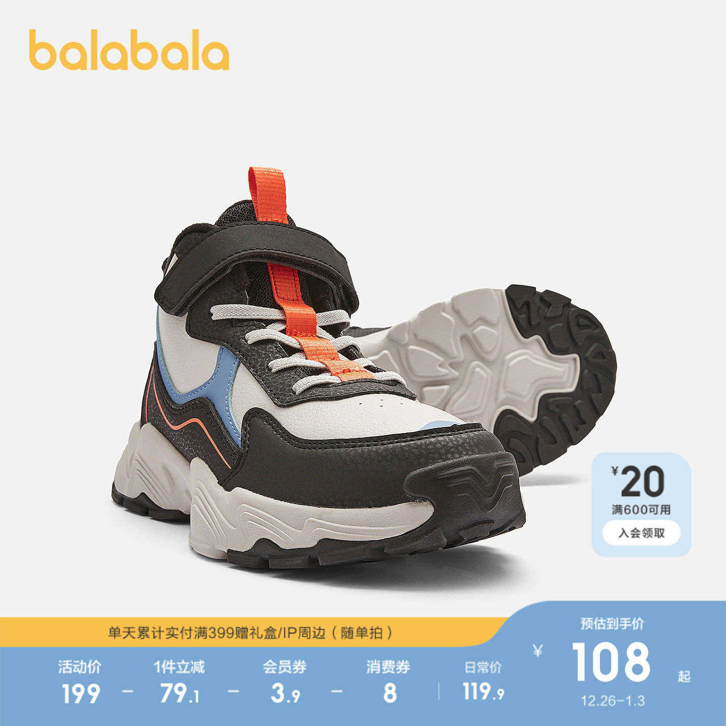 巴拉巴拉童鞋儿童运动鞋男童加绒冬季慢跑鞋中大童撞色时尚潮鞋子