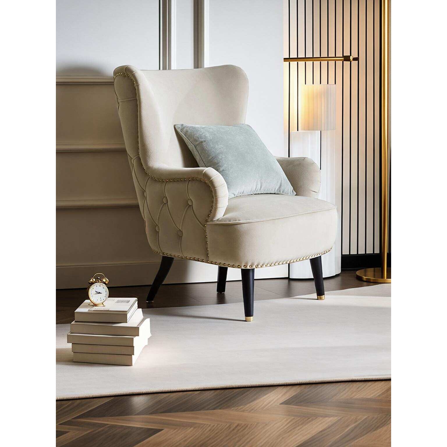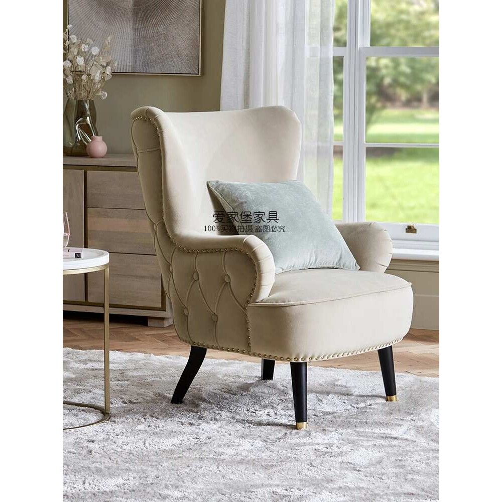 奶油风单人沙发休闲椅轻奢布艺拉扣扶手椅美式复古柳钉洽谈老虎椅
