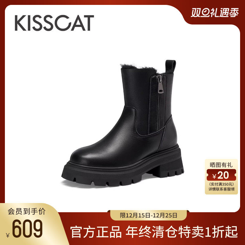 KISSCAT接吻猫秋冬季新款加绒加厚真皮短靴增高冬靴时尚雪地靴女