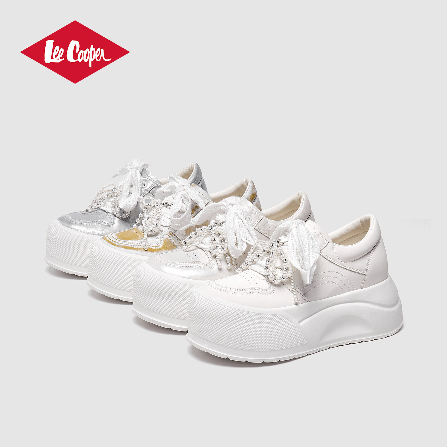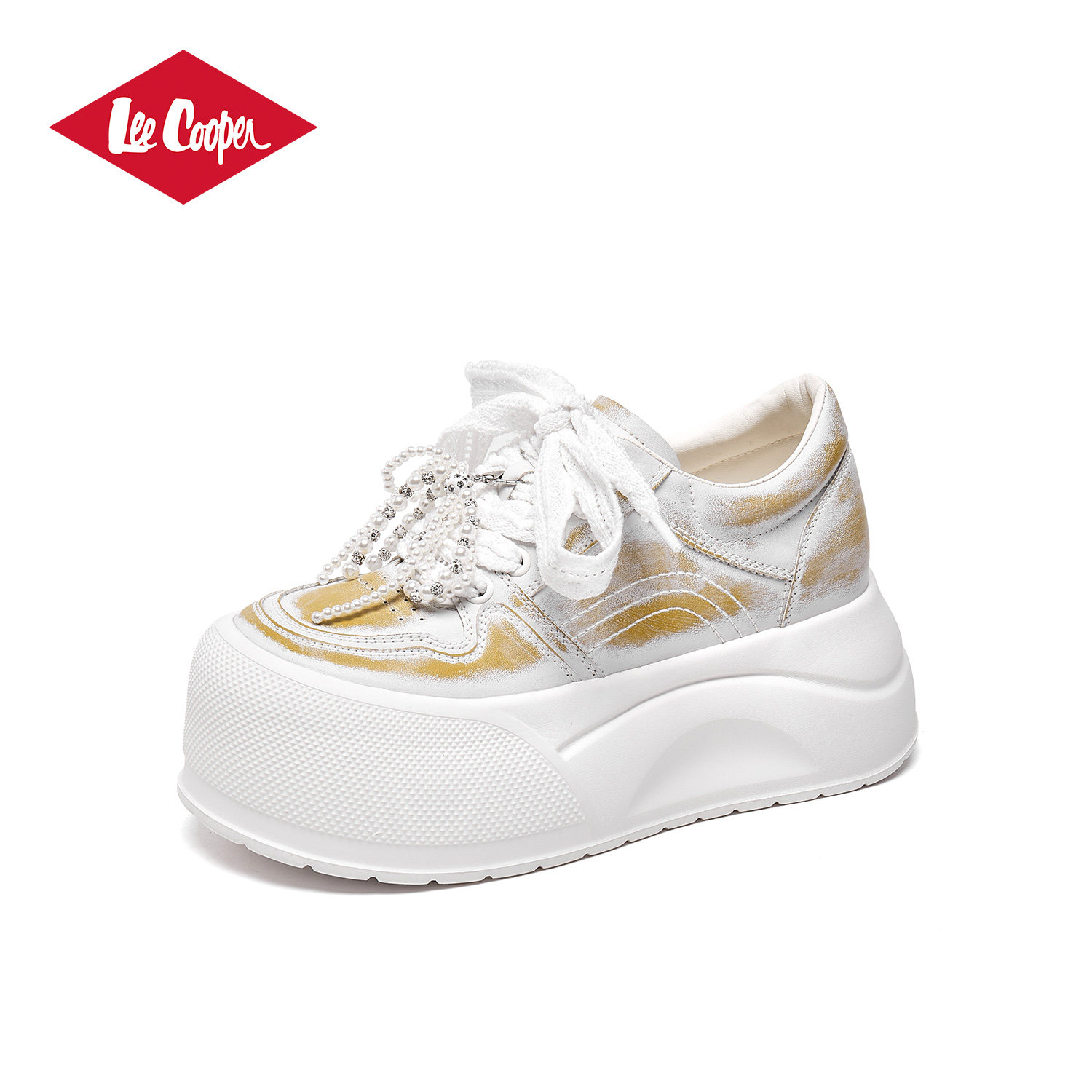 Lee Cooper厚底大头鞋女2025新款珍珠小白鞋系带百搭时尚面包鞋