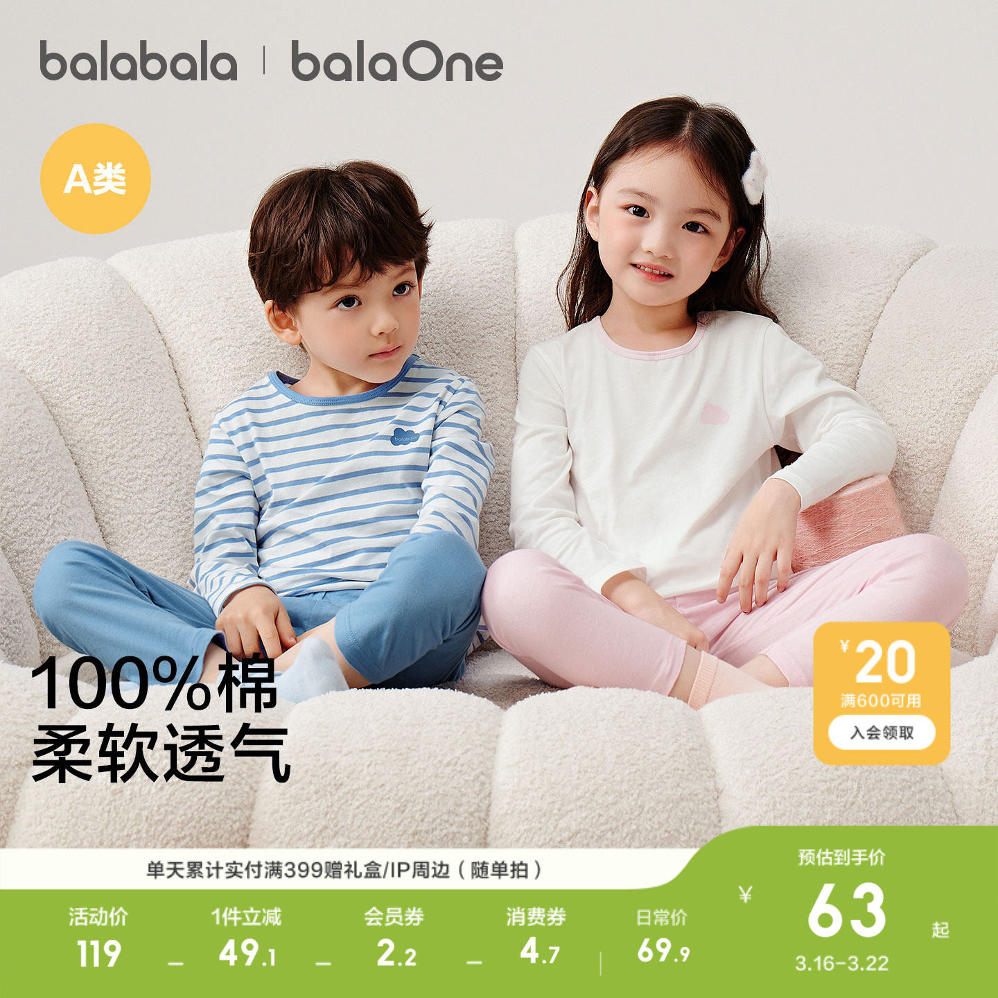巴拉巴拉儿童内衣套装春秋薄男童秋衣秋裤女童宝宝打底衫睡衣纯棉