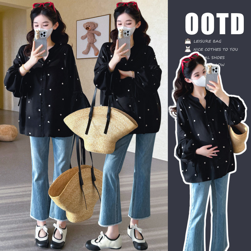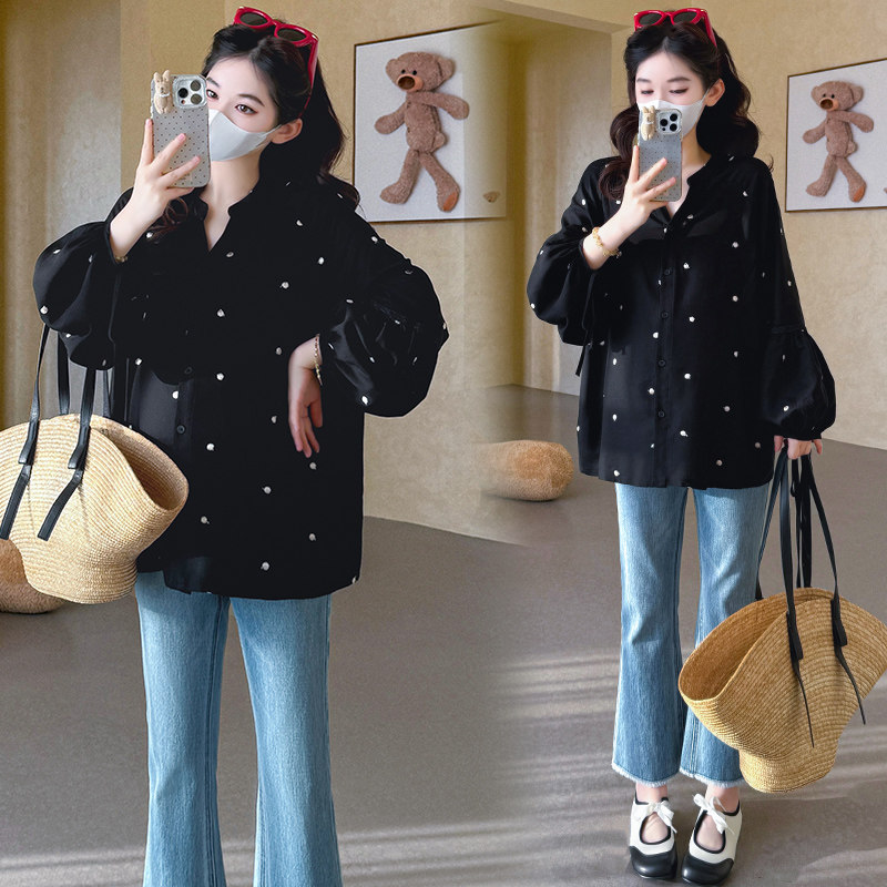 婧麒孕妇装娃娃宽松显瘦衬衣波点上衣洋气遮孕肚灯笼九分袖上衣女