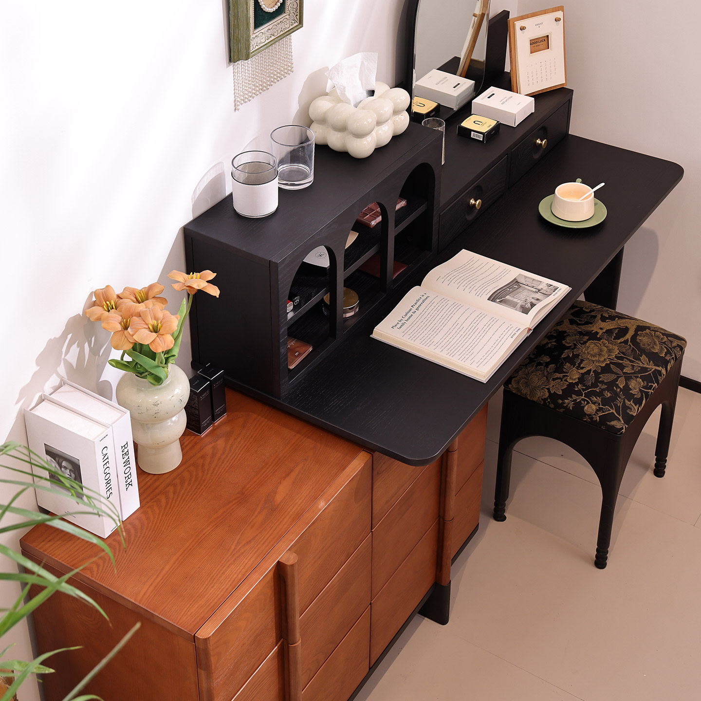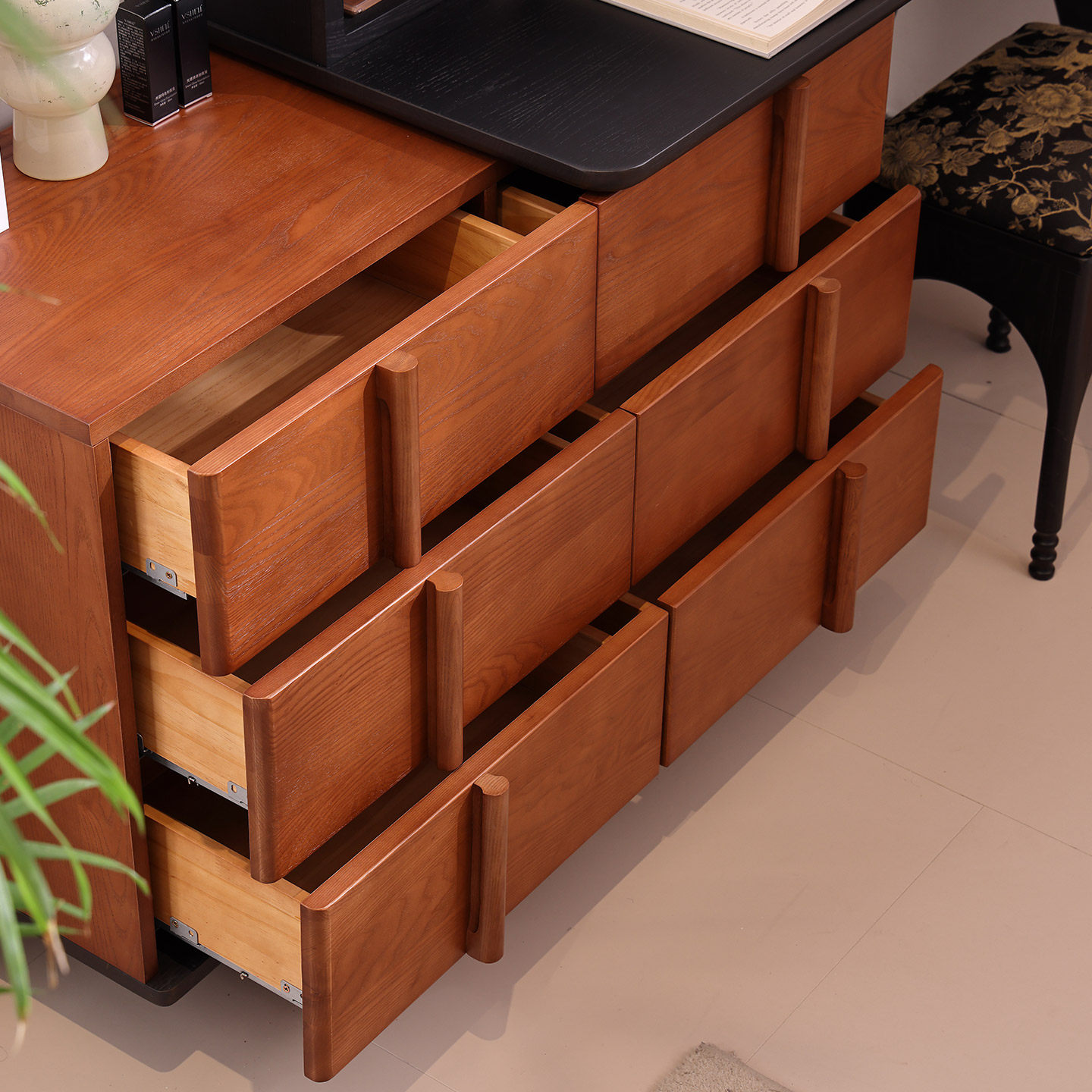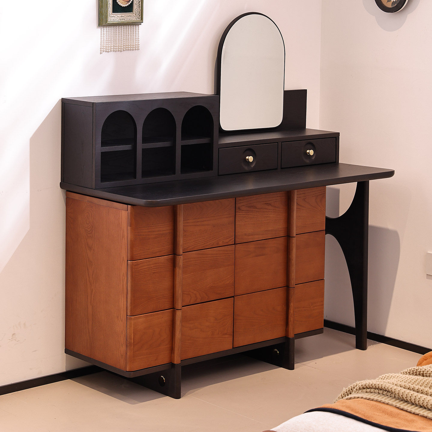 中古风实木梳妆台斗柜一体白蜡木主卧室复古化妆桌高级床尾化妆柜