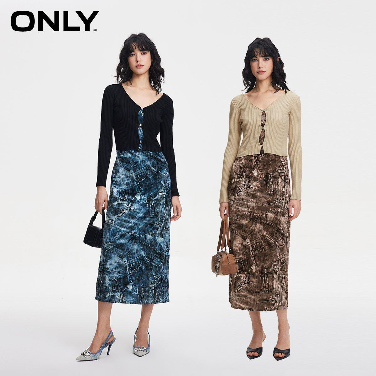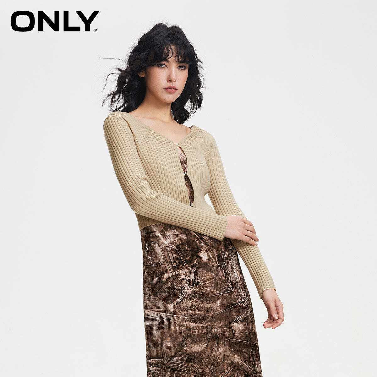 连衣裙两件套 金属搭扣开衫 单宁印花