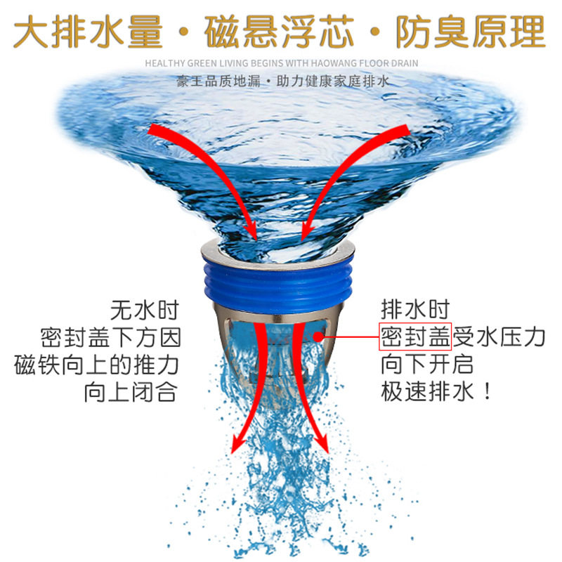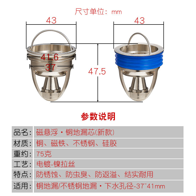 磁悬浮地漏芯防臭防虫返水37-42mm孔径适用大排水量6防地漏封全铜