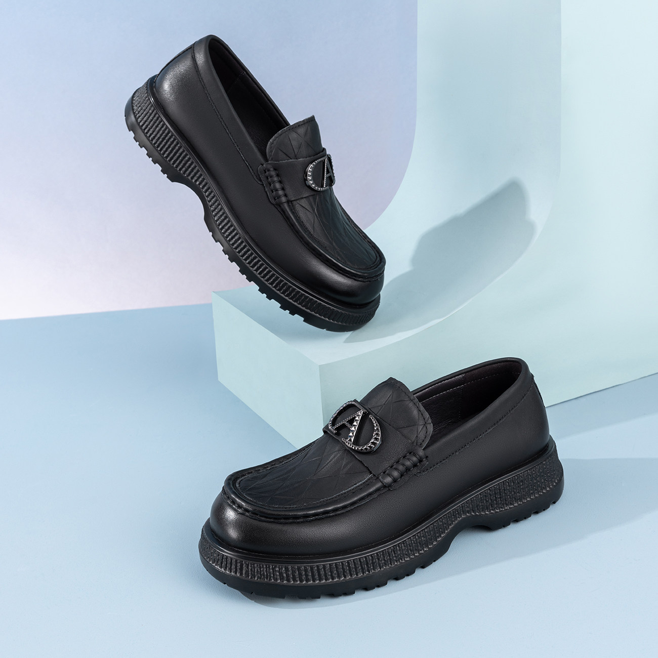 MRA方头乐福鞋男款厚底增高英伦雅痞商务通勤一脚蹬黑色休闲皮鞋