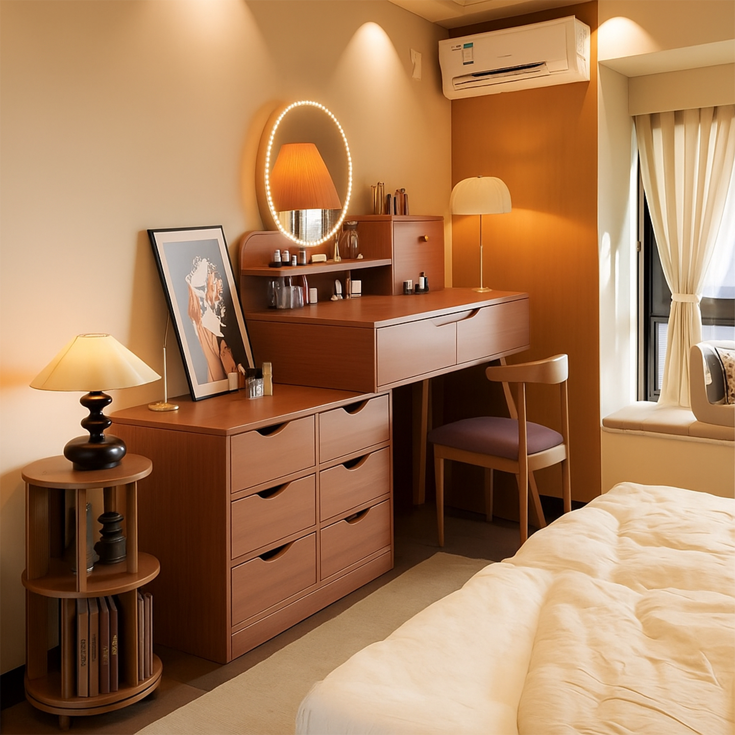 梳妆台斗柜一体新中式卧室家用化妆桌子2026新款可伸缩带镜床边桌