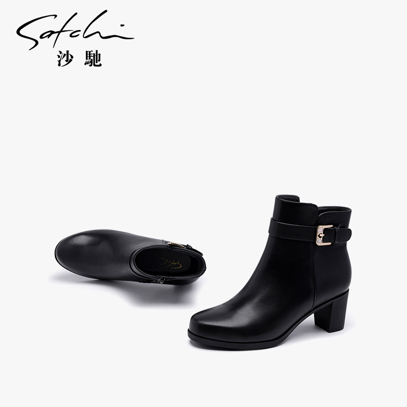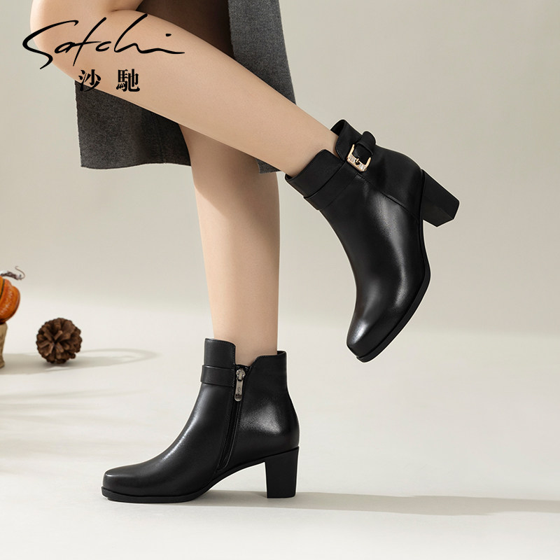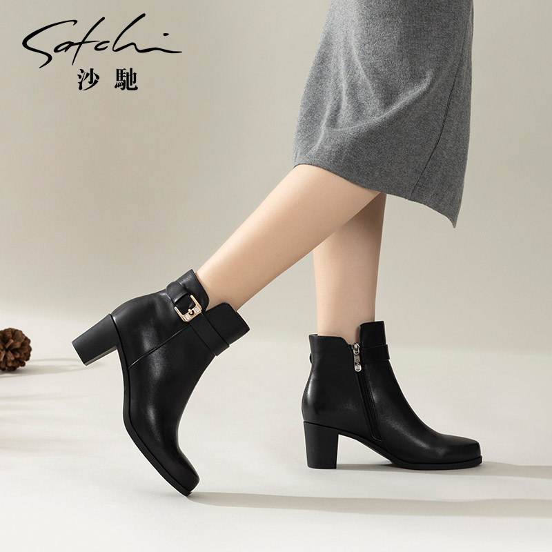 沙驰女鞋粗高跟牛皮革时装靴女靴真皮短筒靴子2025冬新款通勤短靴