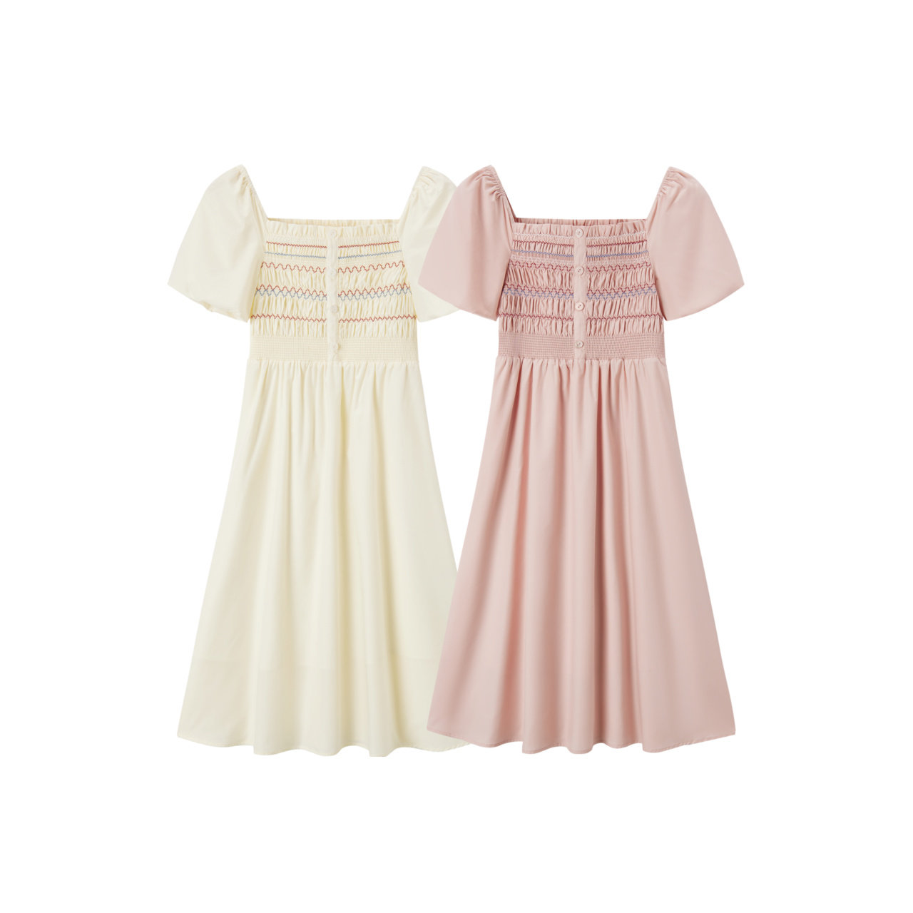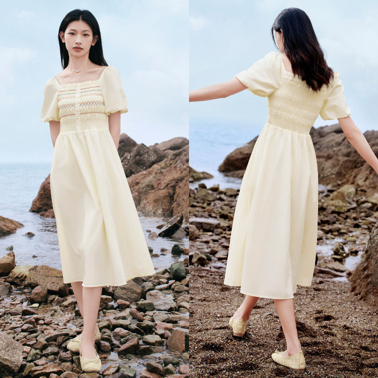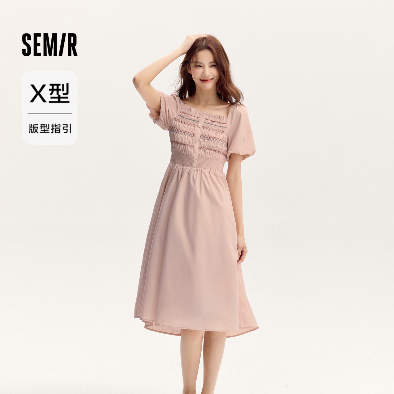 森马连衣裙女方领泡泡袖修身气质2024夏新款俏皮民族风中长裙优雅