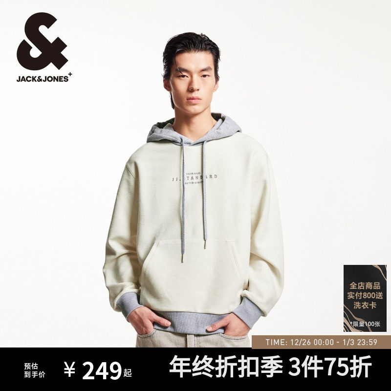 杰克琼斯男装秋冬潮胸前字母刺绣衣身肌理感撞色拼接长袖连帽卫衣