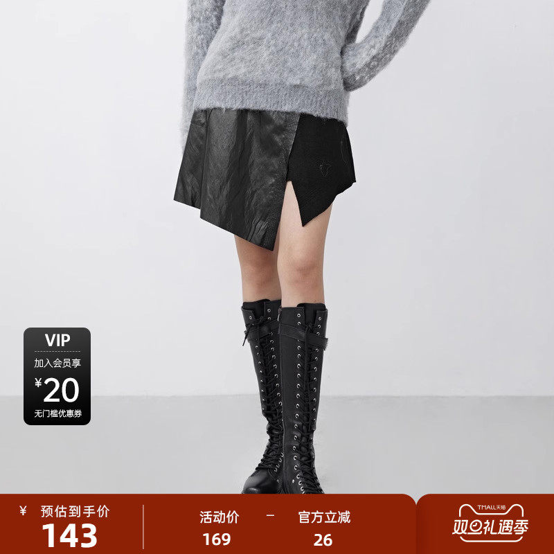 sdeer圣迪奥女装冬裙子个性拼接不规则毛呢A字黑色短裙S21481307
