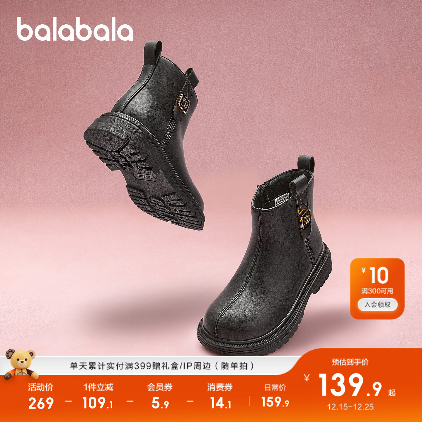 巴拉巴拉童鞋儿童靴子马丁靴女童2025新秋冬短靴拉链潮流百搭鞋子