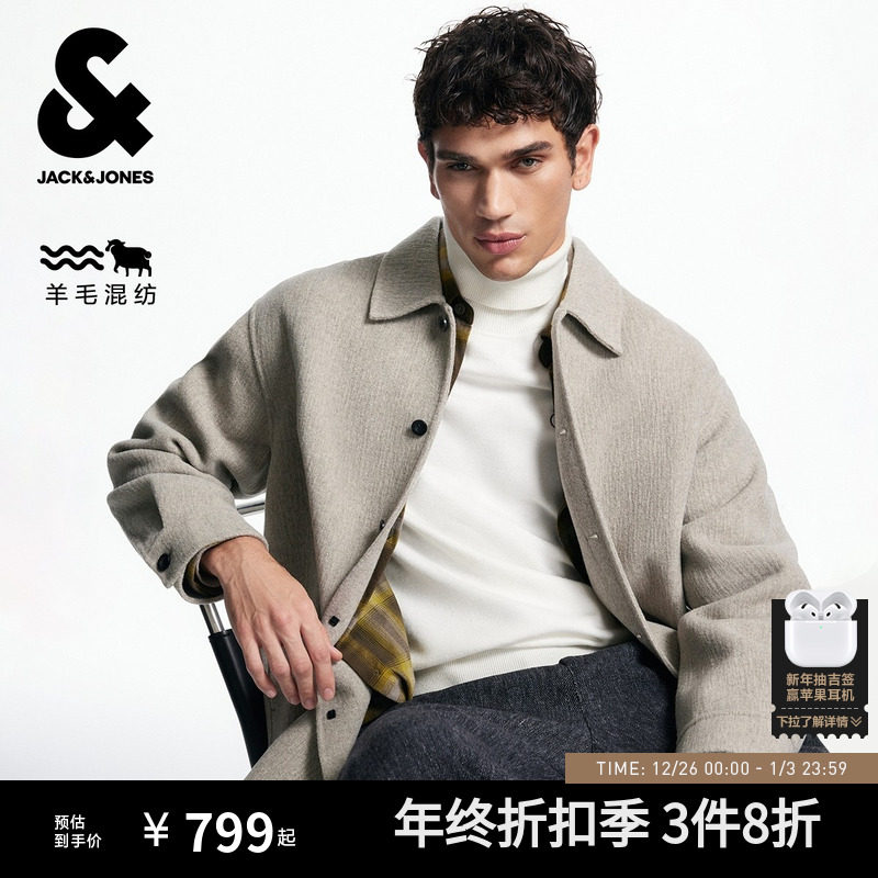 杰克琼斯男装士秋冬新款毛呢大衣时尚百搭长袖宽松尖领潮流上衣