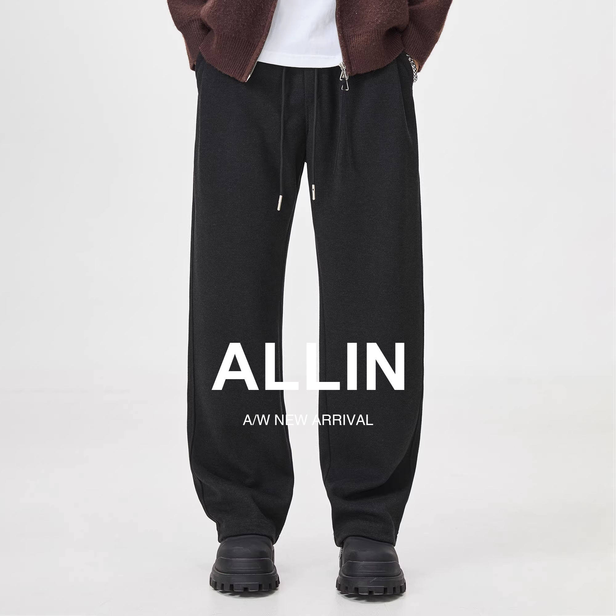 ALLIN 黑色弯刀休闲裤男秋冬含绵羊毛垂感直筒卫裤微喇垂感长裤子