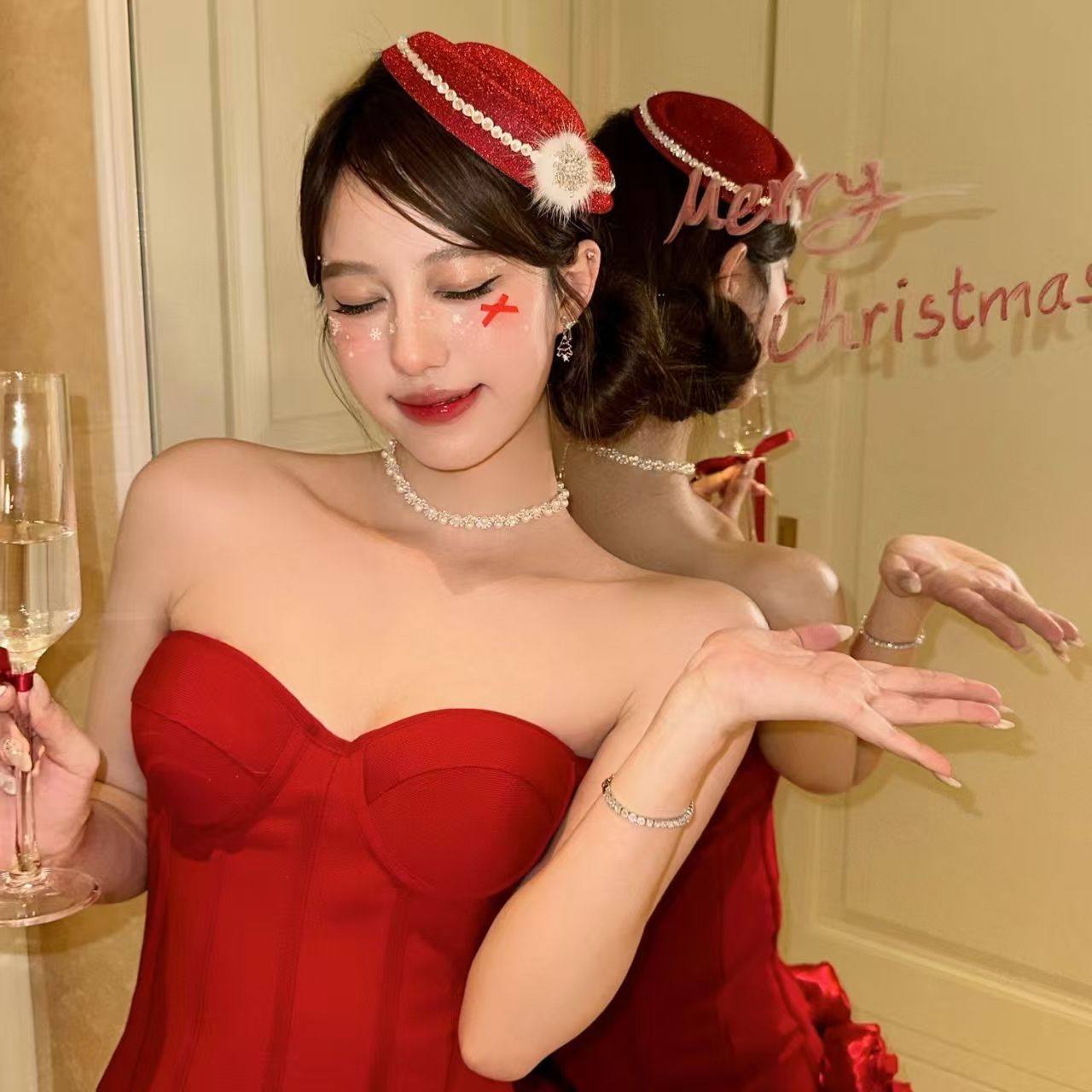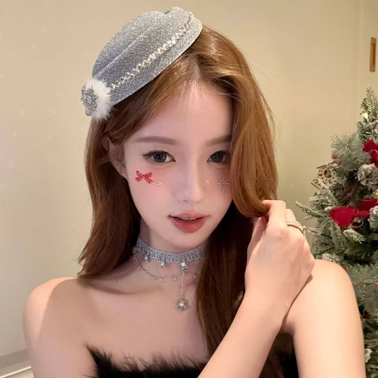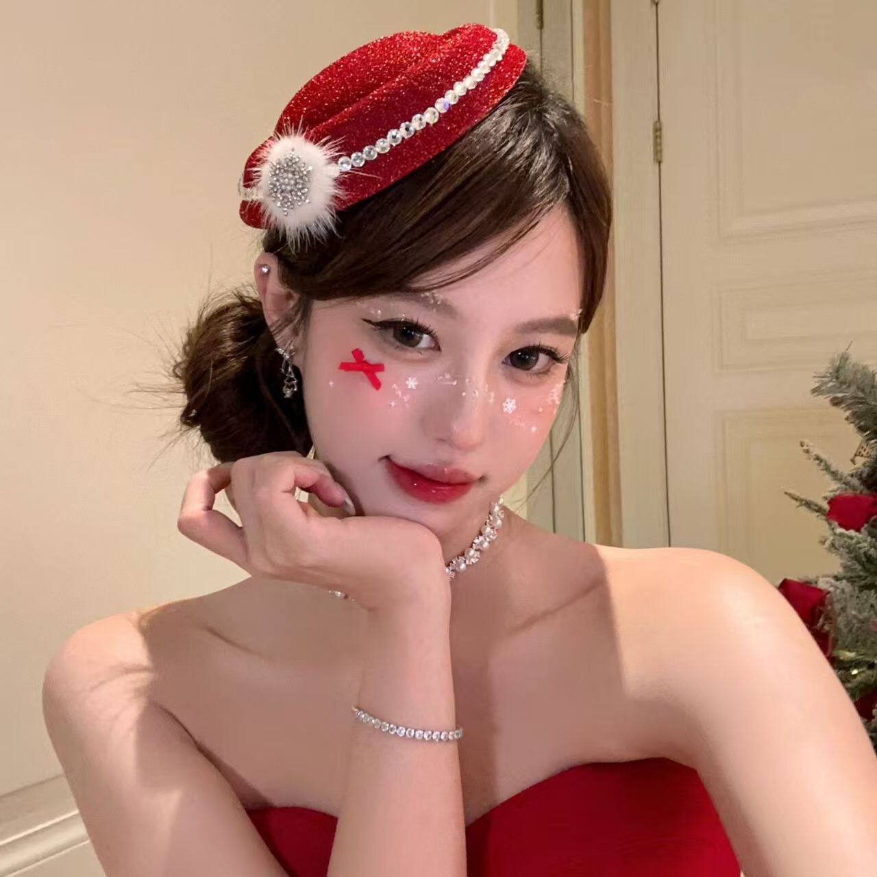 氛围圣诞cos闪钻雪花毛球红色小礼帽发夹女穿搭拍照头饰短发樱桃