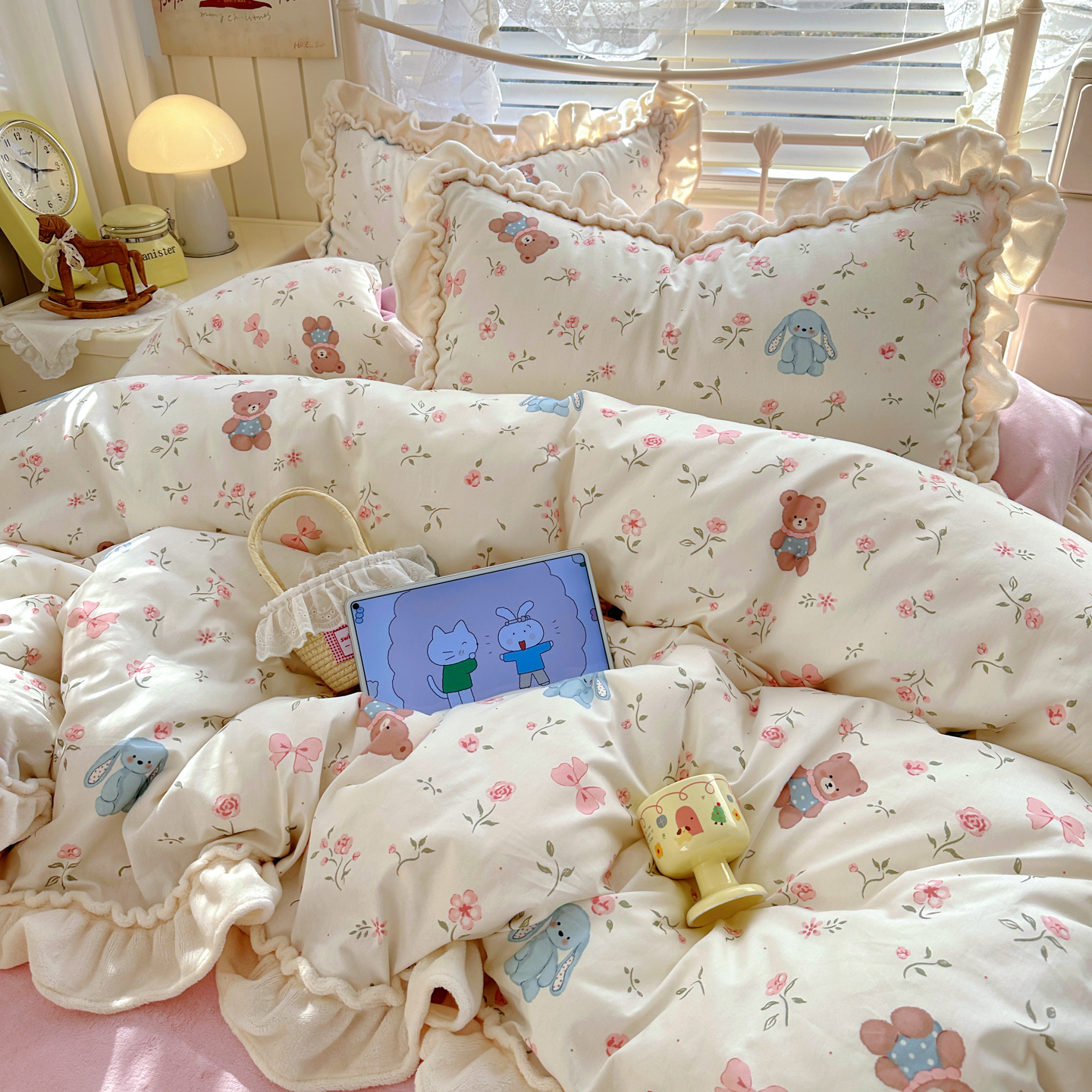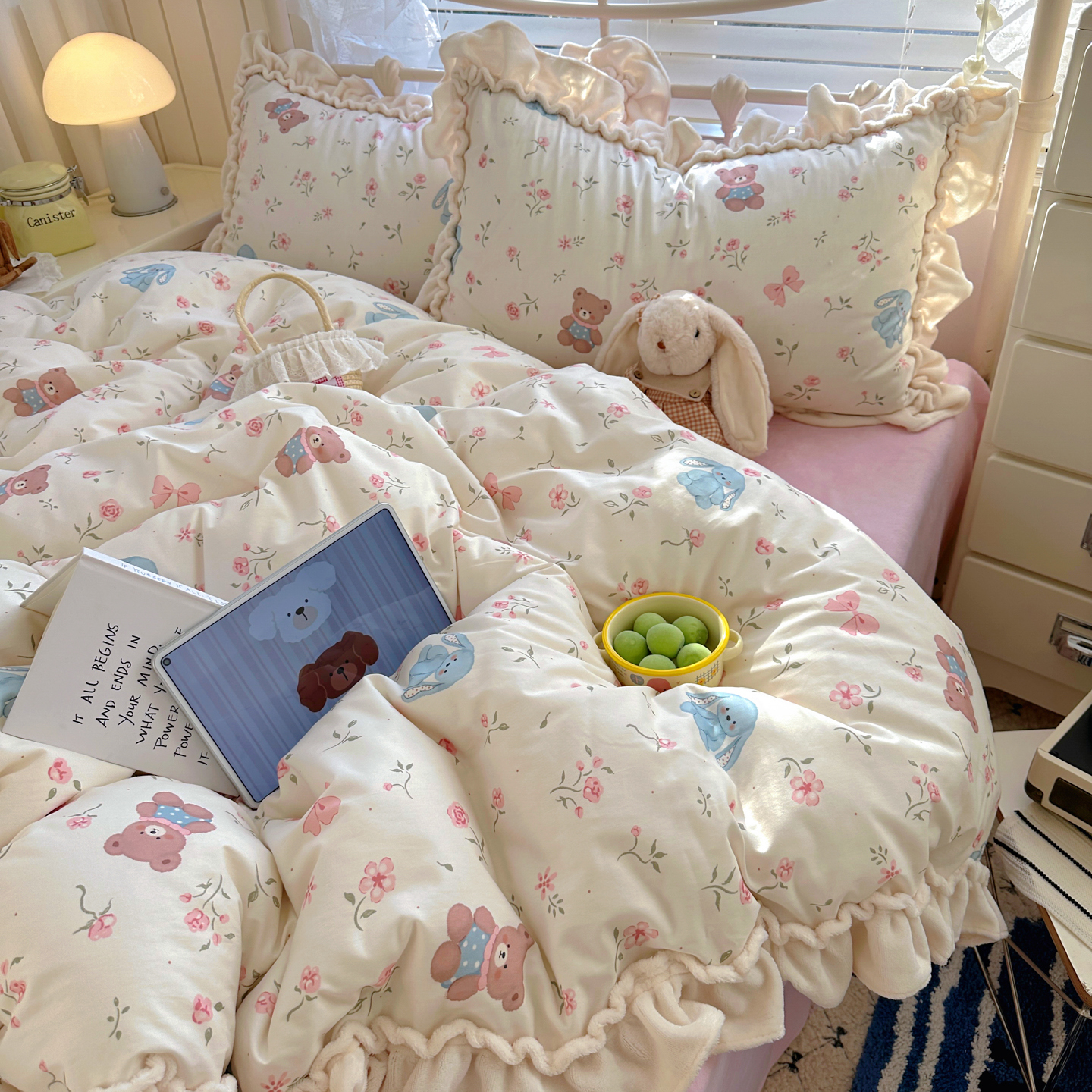 四件套冬季纯棉加绒花边款ins风床单被套保暖套件床上用品