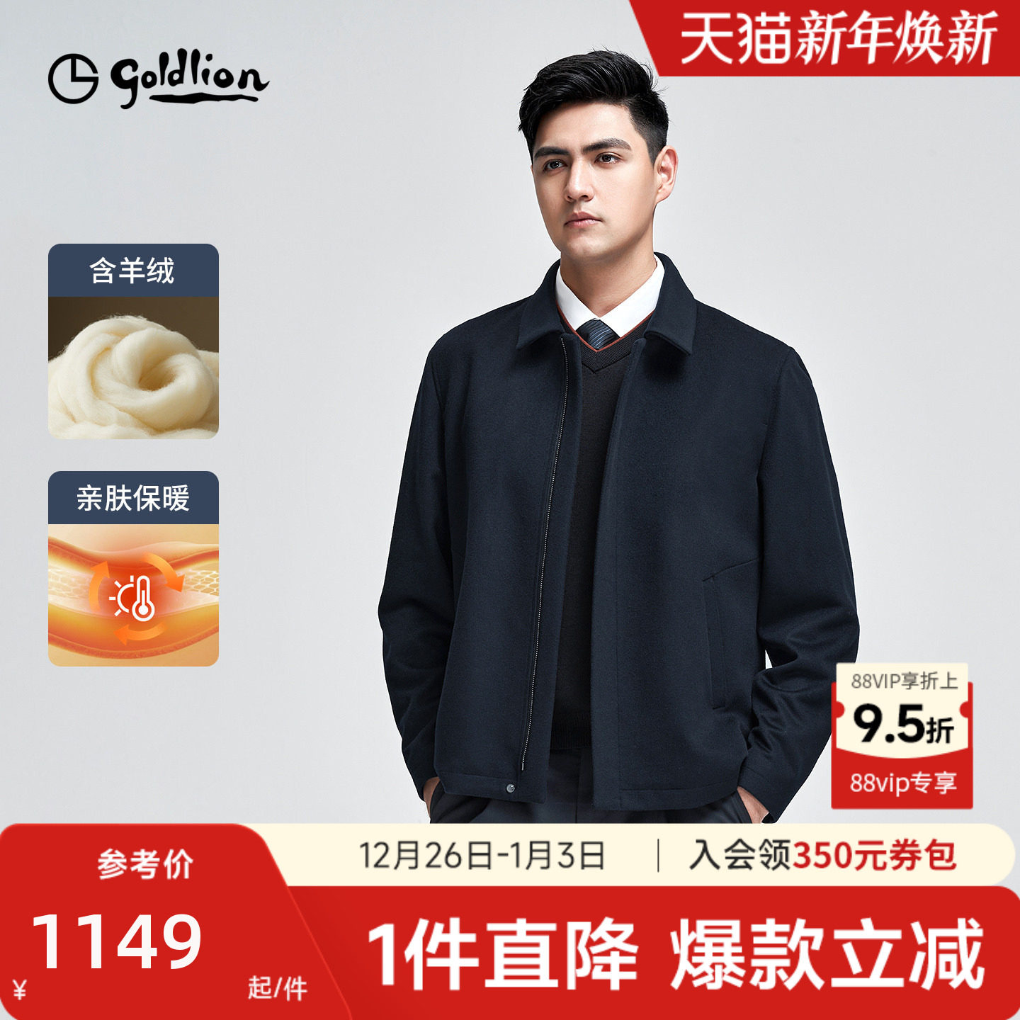 【羊绒夹克】金利来25秋冬新款男士羊毛短款呢外套毛呢翻领夹克男