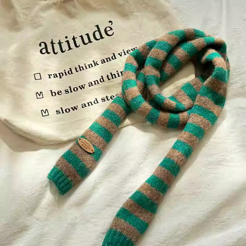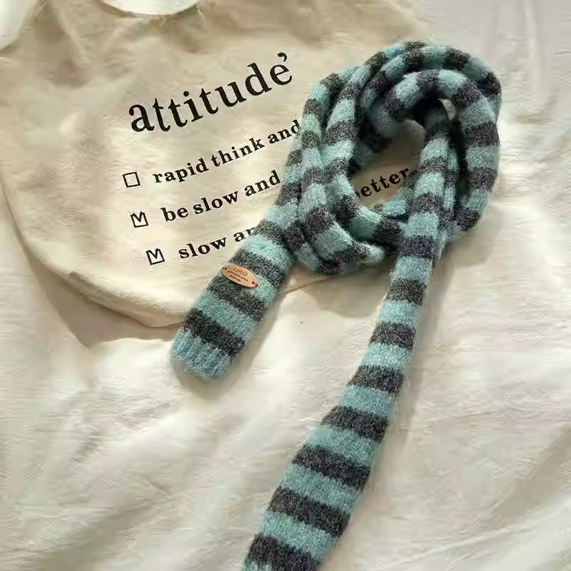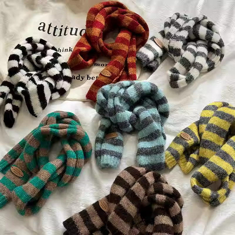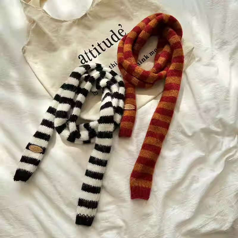 小众Y2k长条手工针织拼色围巾男女日系百搭围脖潮条纹黑白咖色