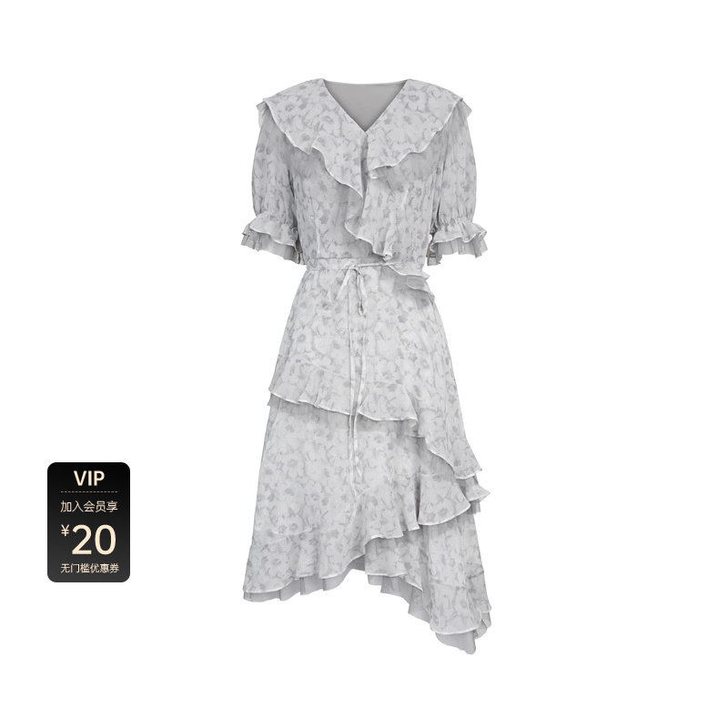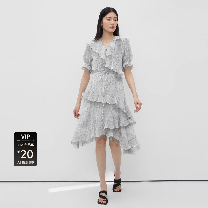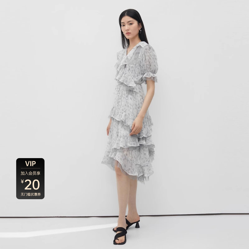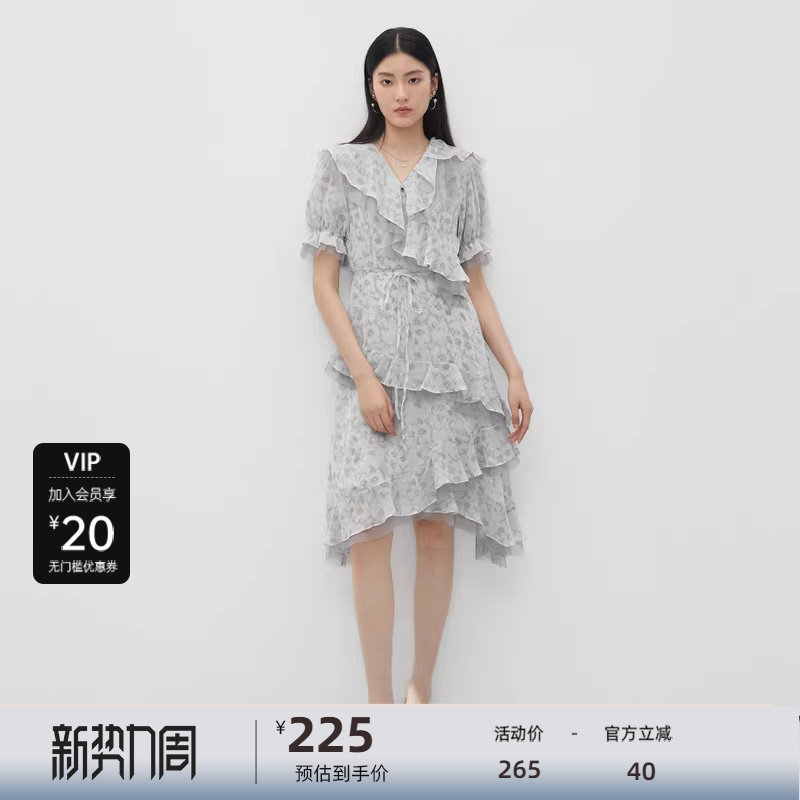 sdeer圣迪奥女装V领荷叶边碎花收腰网纱连衣裙S232Z12J8