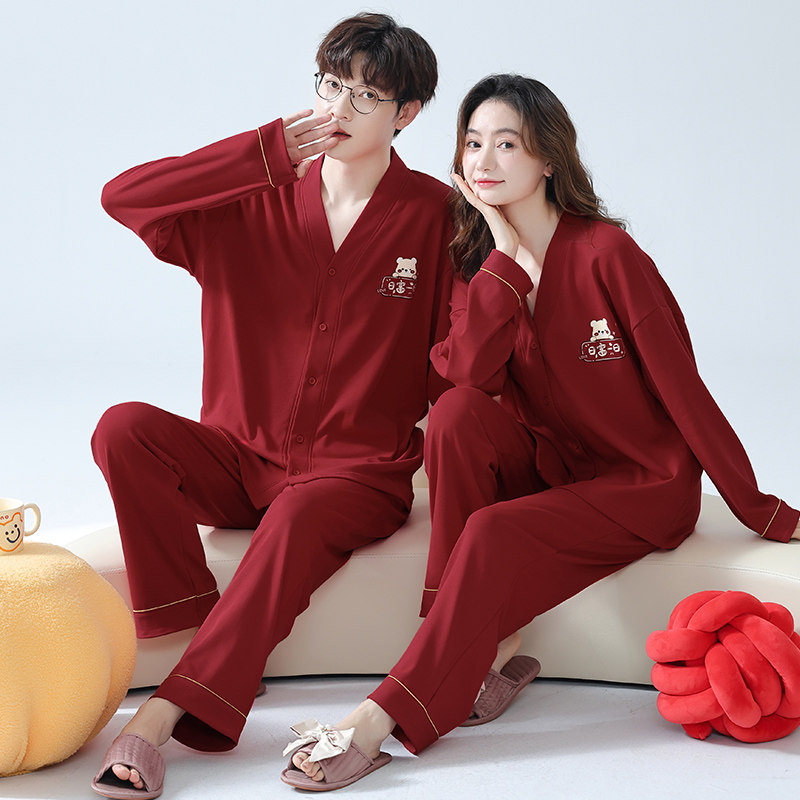 情侣结婚新婚秋冬款大红色睡衣开衫长袖套装本命年男女家居服柔软