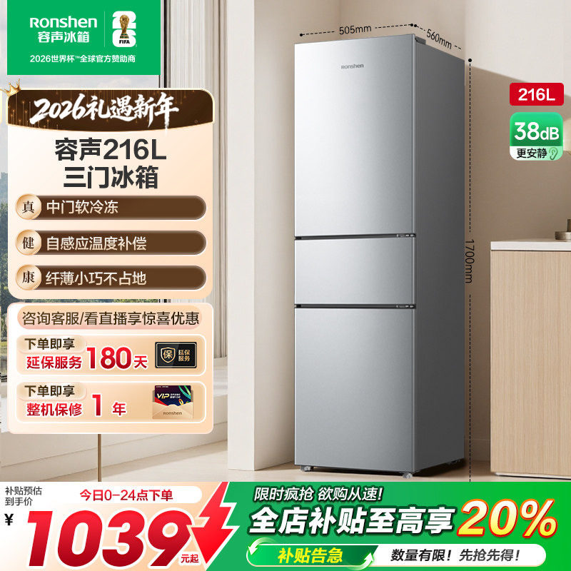 容声216升三开门三门变温家用小型冰箱宿舍以旧换新补贴