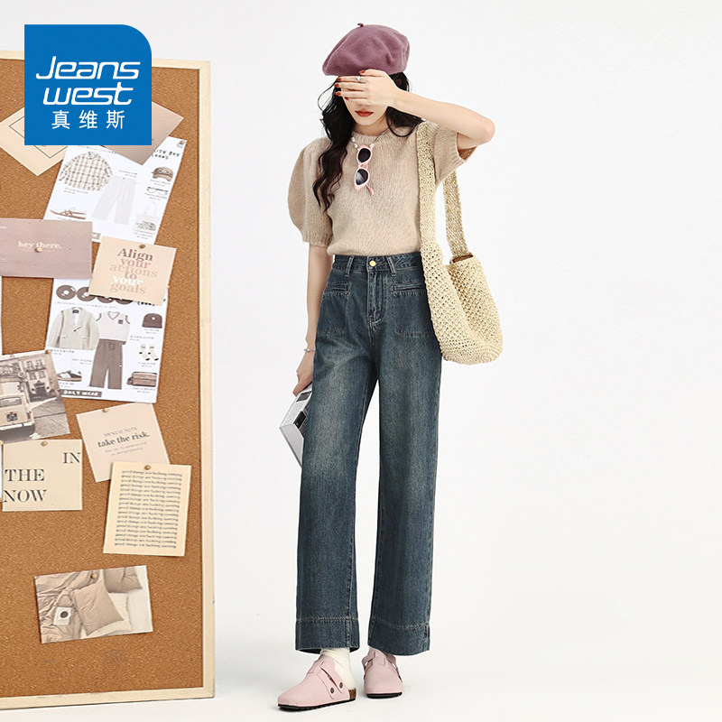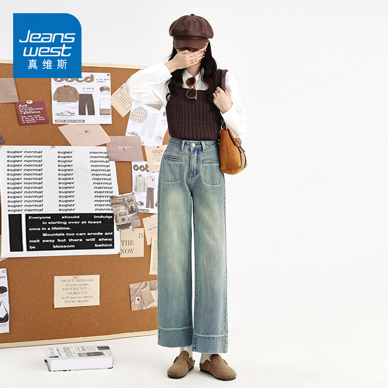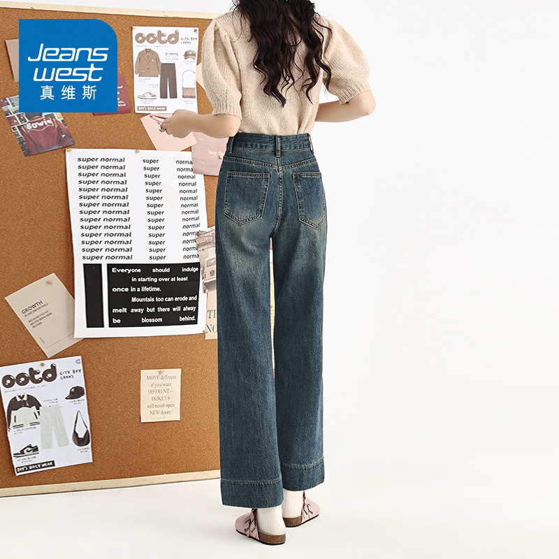 KZ真维斯春季直筒牛仔裤女宽松显高显瘦高腰复古美式春秋款裤子女
