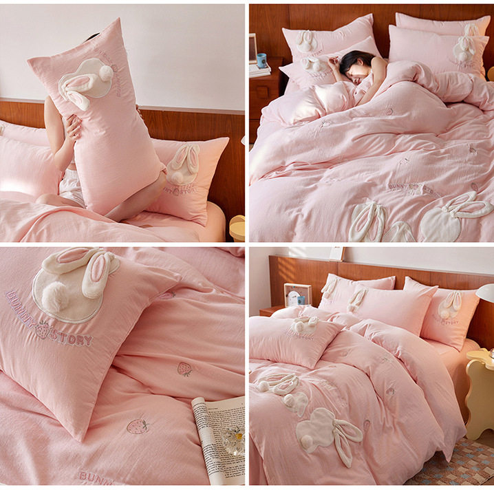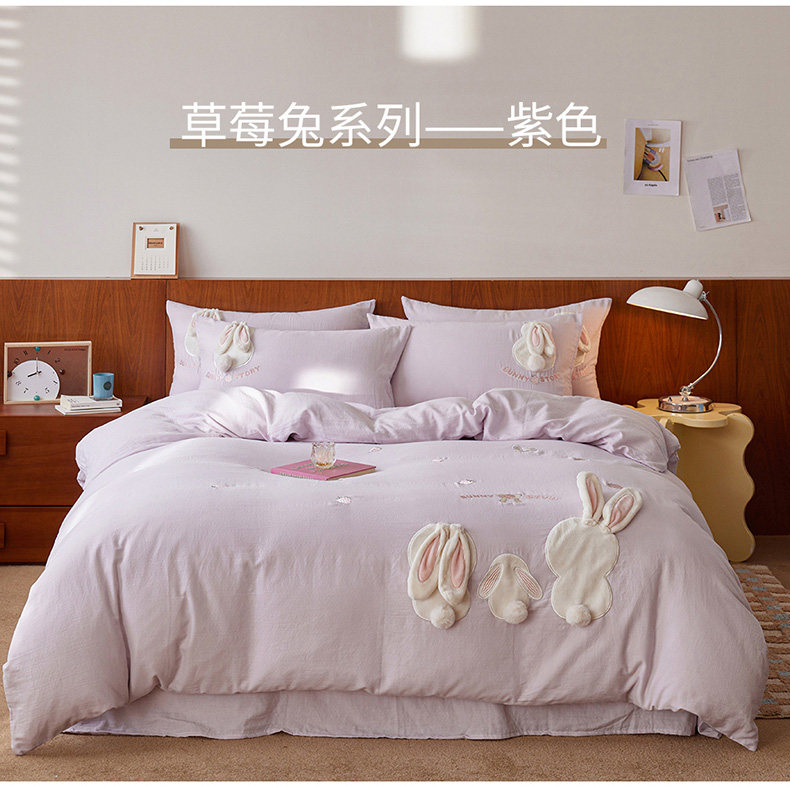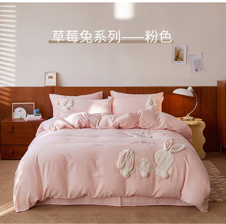 A类全棉水洗双层纱四件套草莓兔可爱兔子刺绣床品套件简约卡通