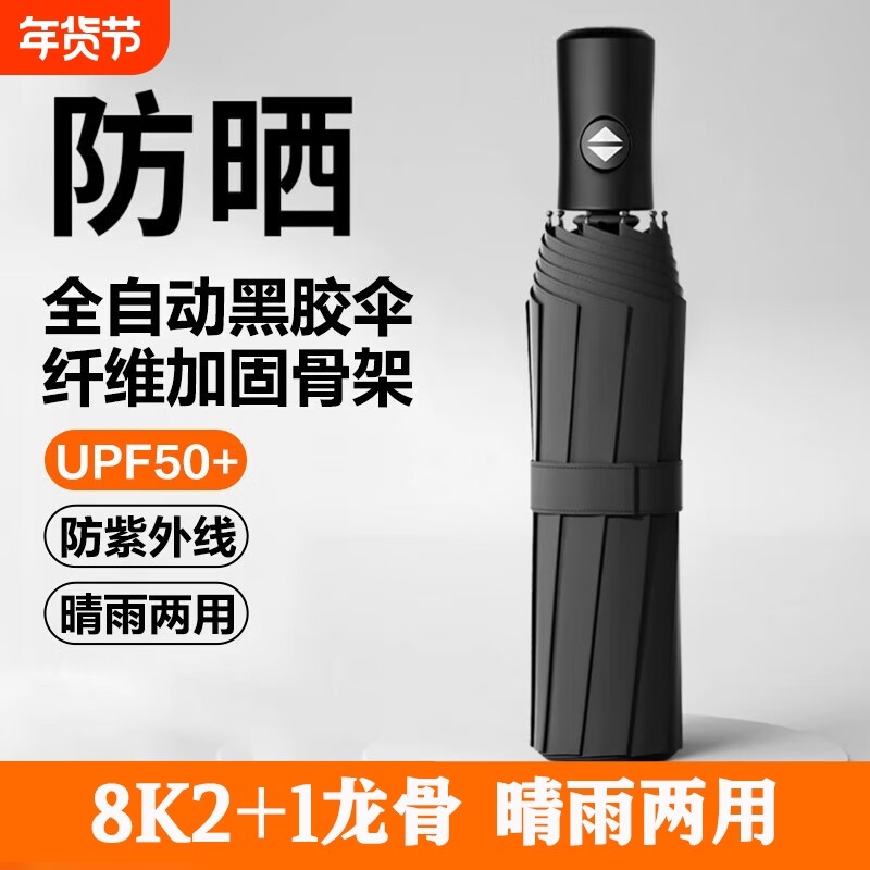全自动八骨自动雨伞黑胶防晒防紫外线晴雨伞加大加固三折叠两用