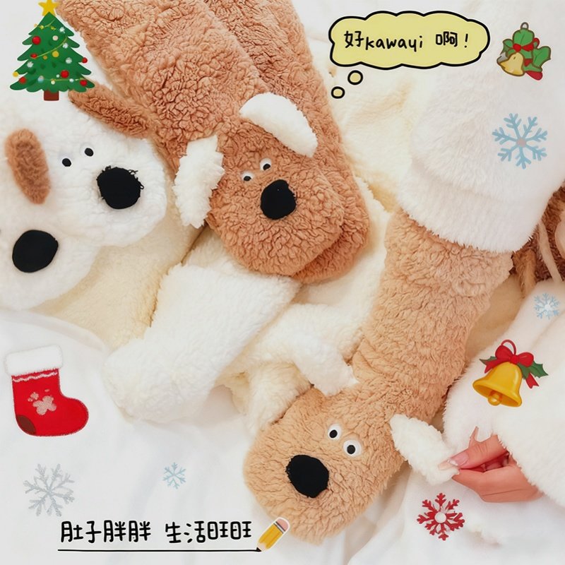 地板袜可爱小狗加绒加厚居家防滑秋冬保暖袜女睡眠袜圣诞袜子中筒