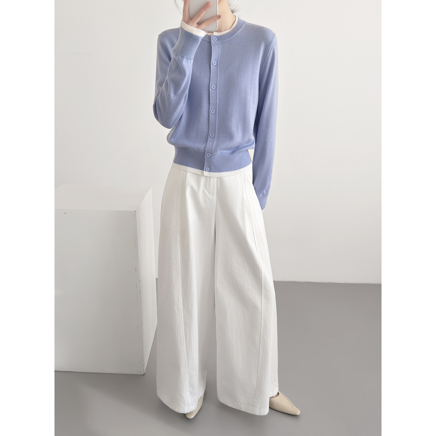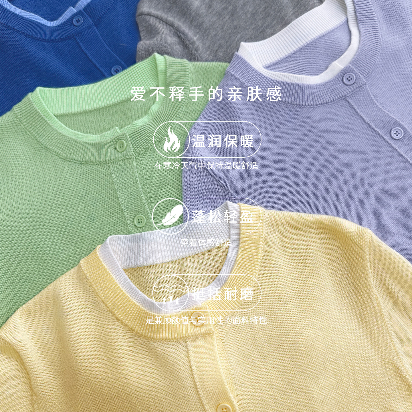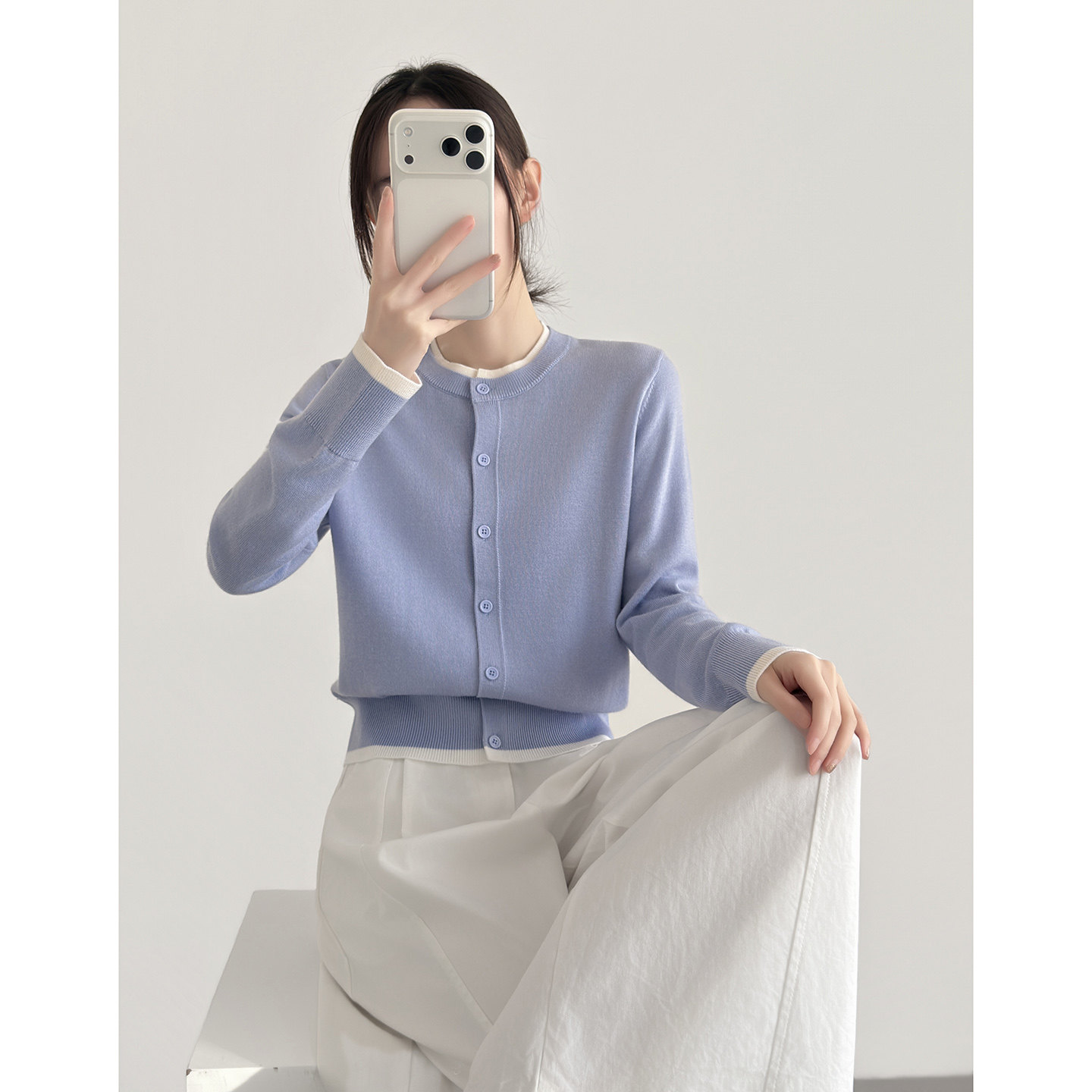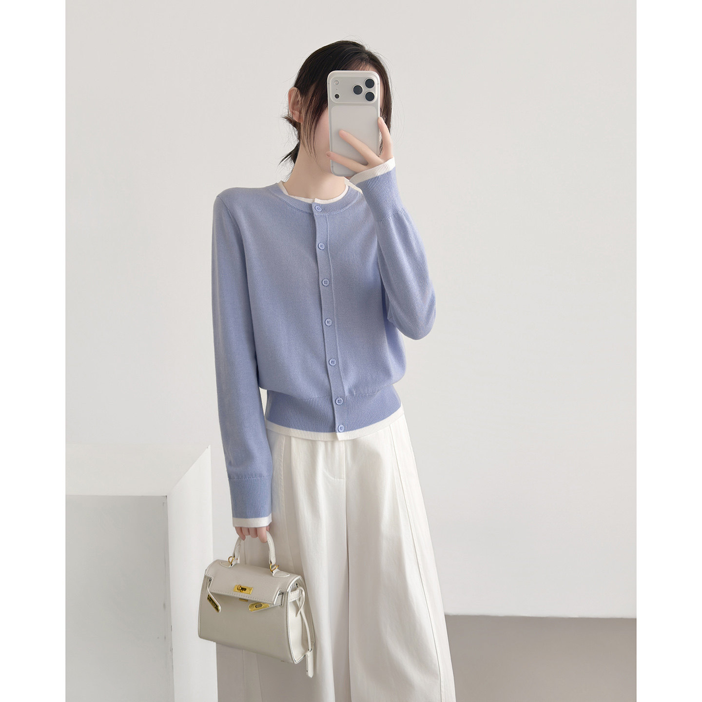 蓝色假两件撞色圆领针织开衫外搭女早春新款可机洗绵羊毛毛衣外套
