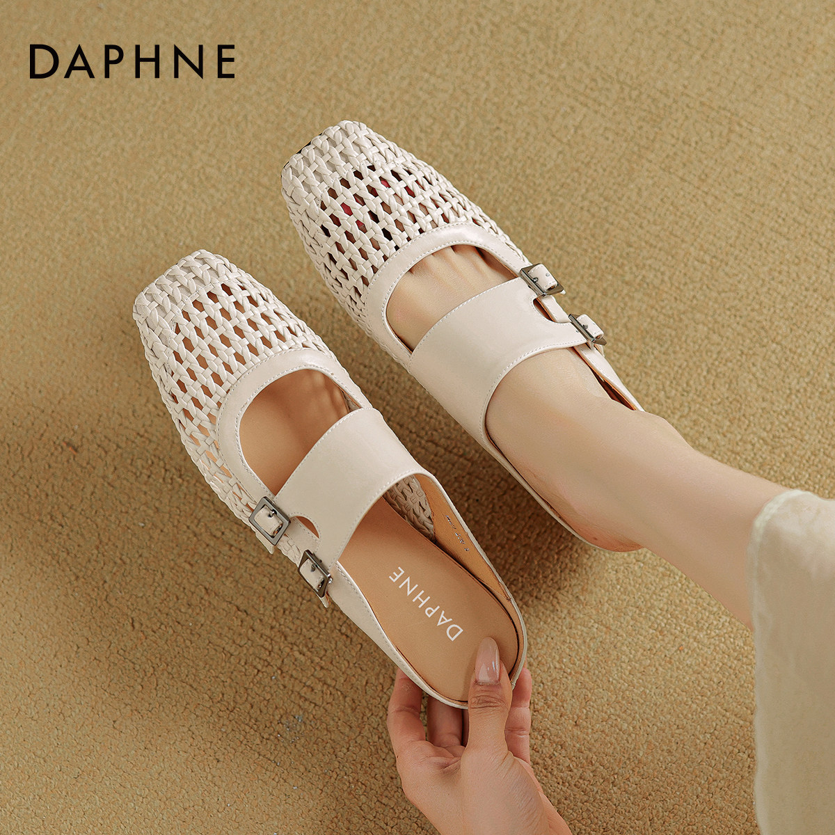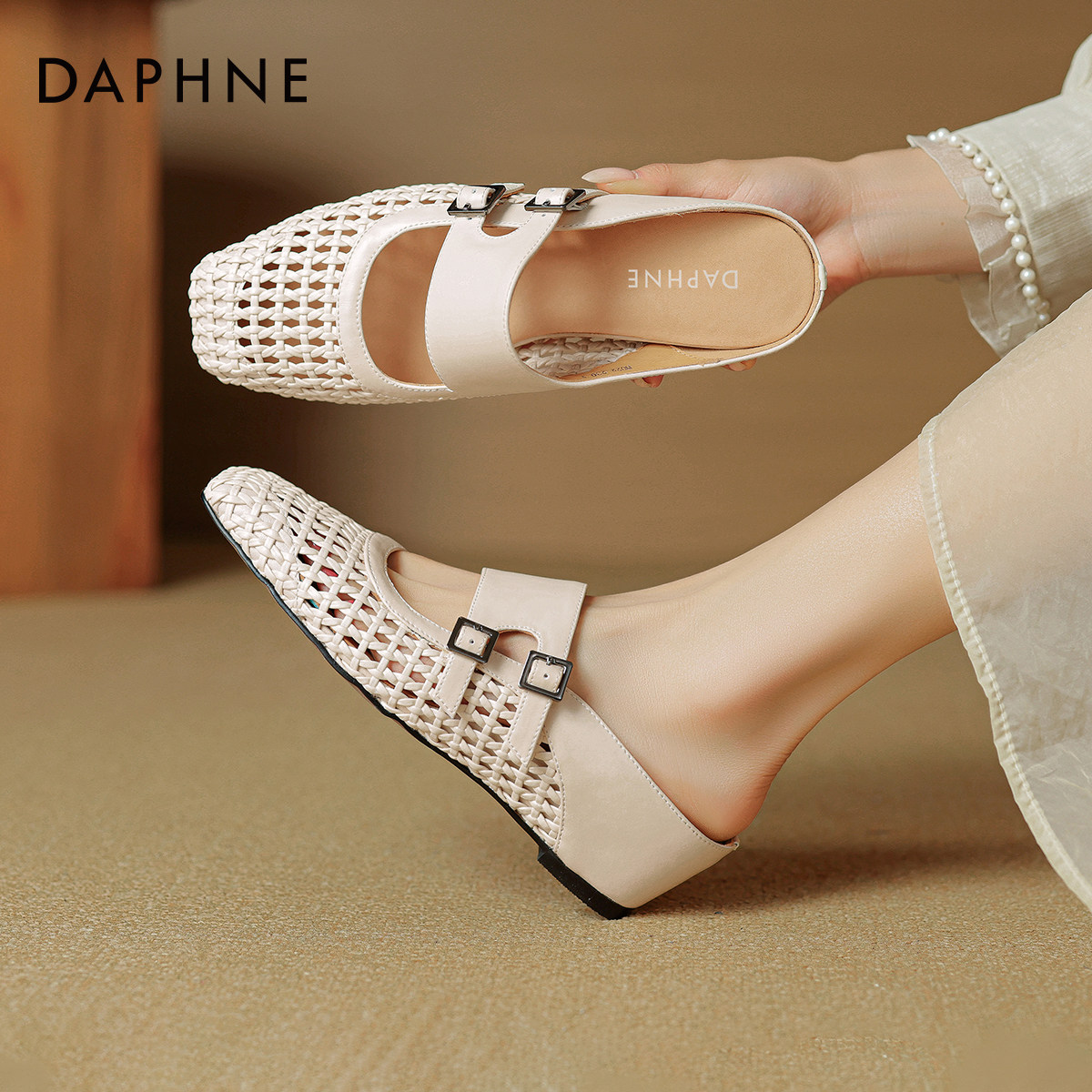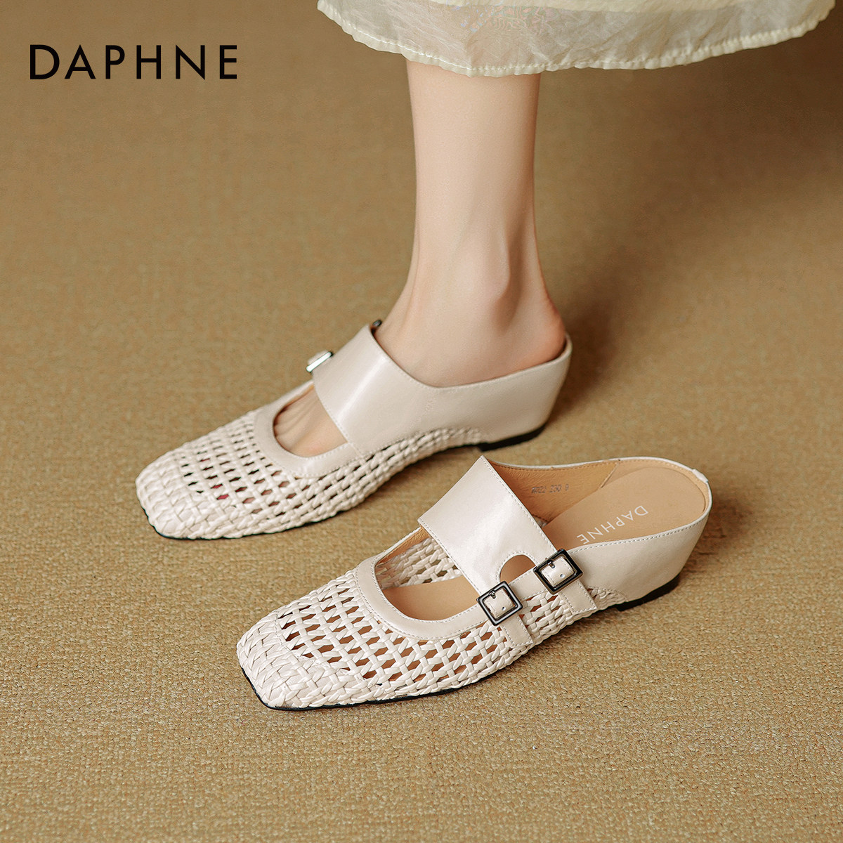达芙妮坡跟拖鞋女夏外穿2026新款编织女鞋镂空平底半拖包头凉拖鞋