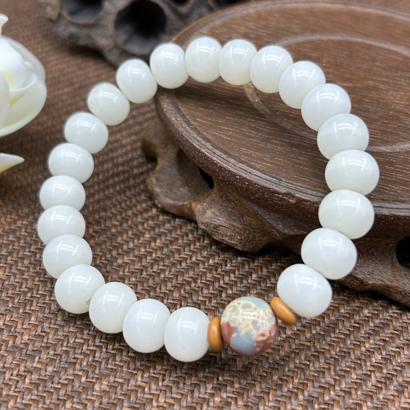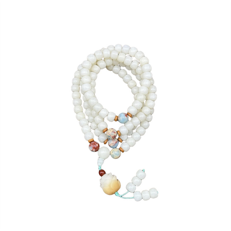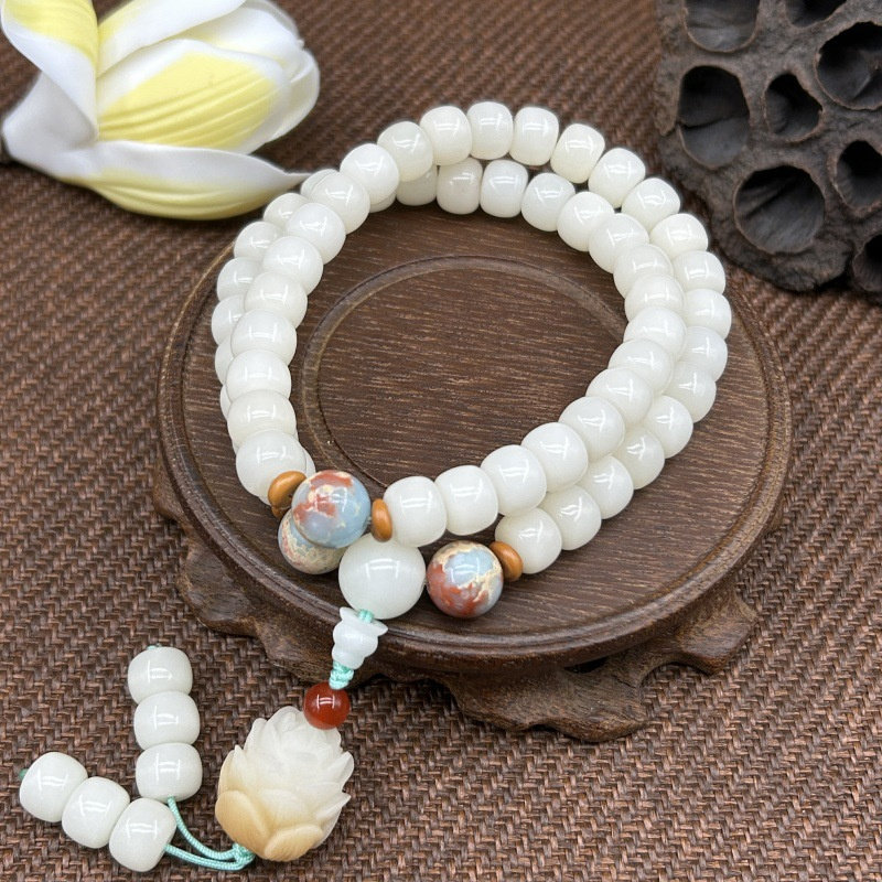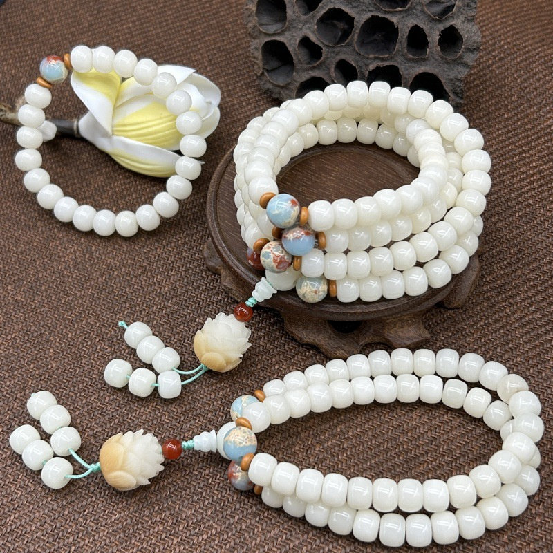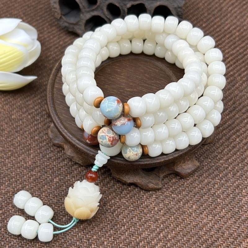 白玉菩提根108/颗佛珠手串寿山石配饰莲花菩提籽佛珠念珠文玩手链