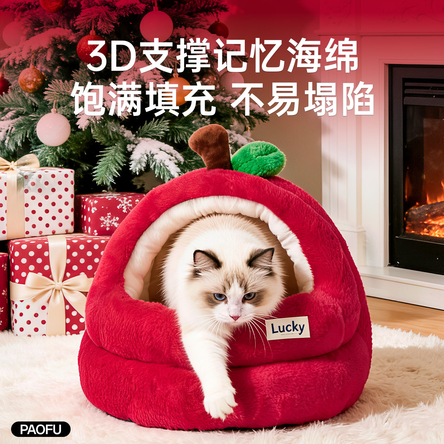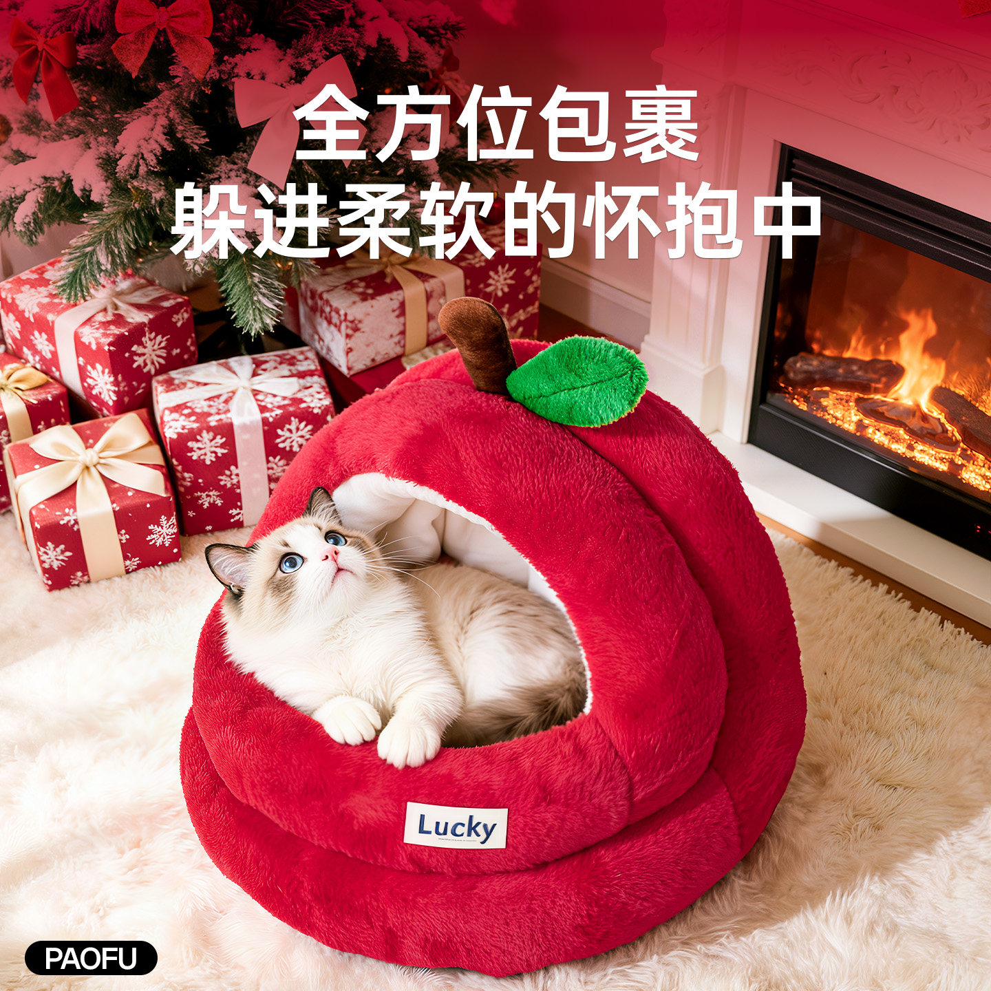幸运苹果圣诞猫窝四季通用宠物窝毛绒保暖封闭式猫咪睡觉窝床垫子
