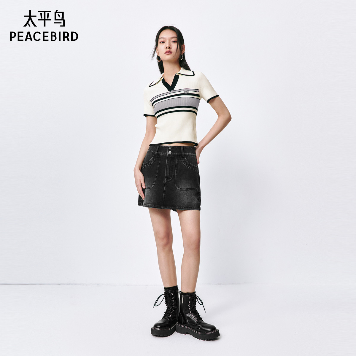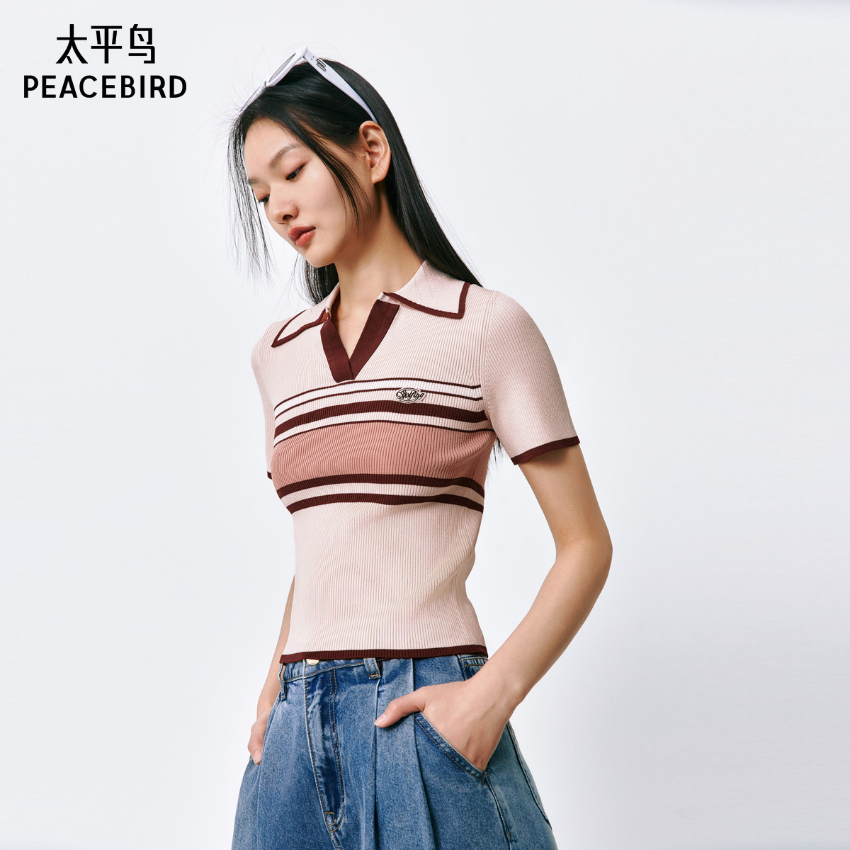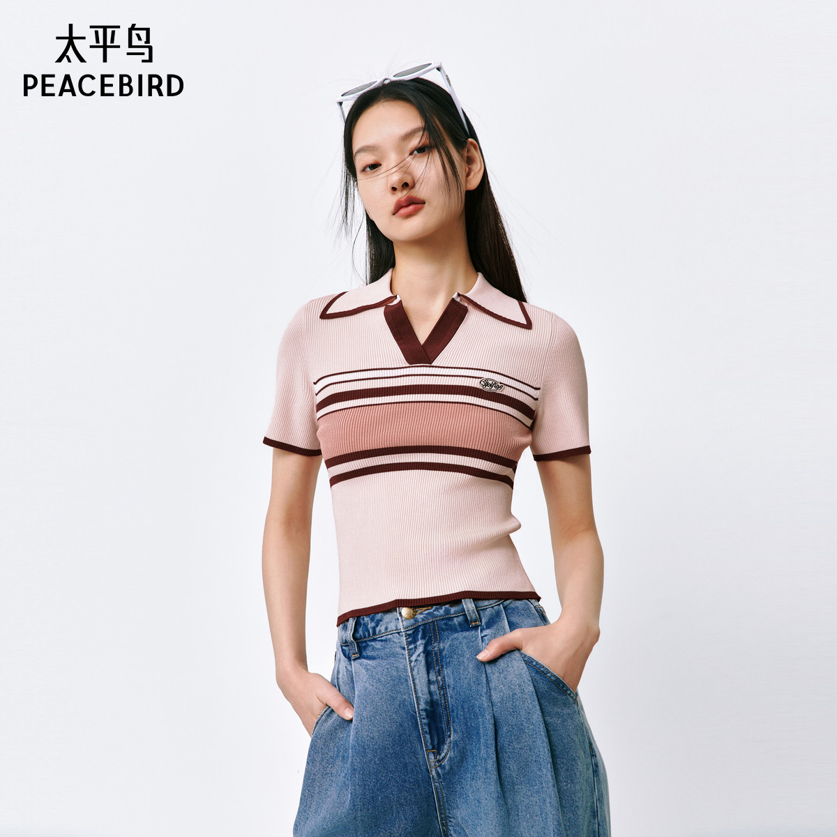 太平鸟POLO领撞色条纹针织上衣女夏装款翻领修身时尚短袖