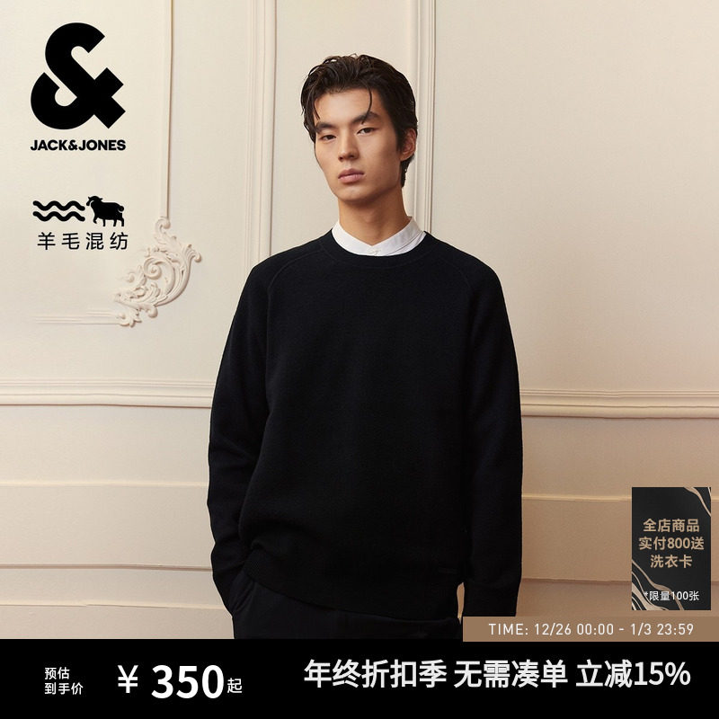 杰克琼斯男装士秋冬新款百搭针织衫宽松罗纹圆领毛衣皮质logo