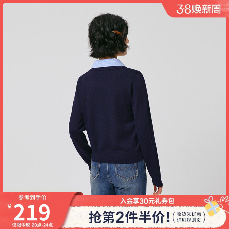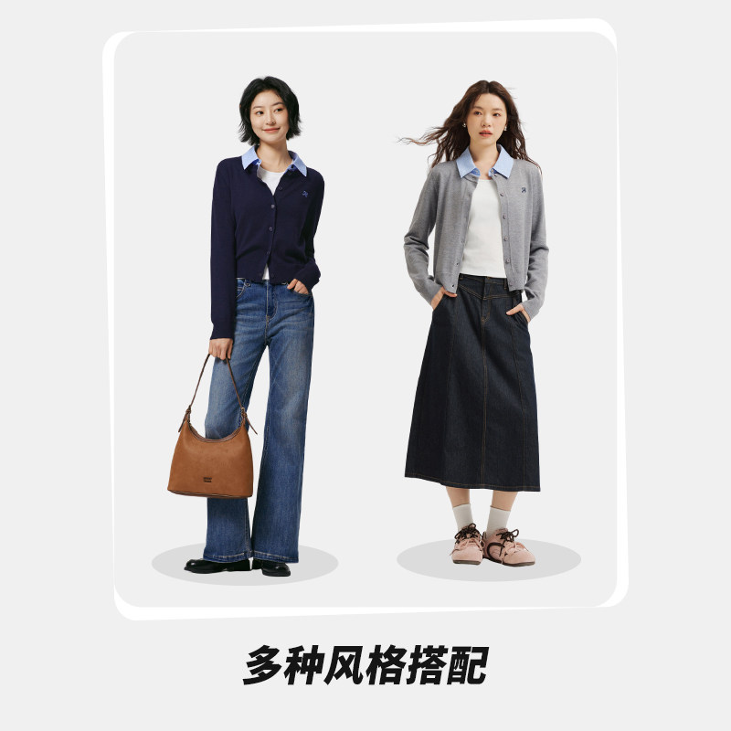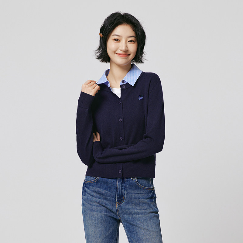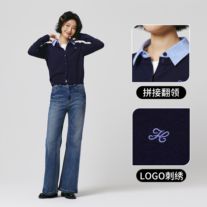 热风2026年春季新款女士拼接领宽松刺绣针织开衫通勤简约百搭上衣