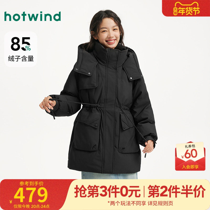 热风2025年冬季新款女士时尚收腰连帽羽绒服掐出腰线保暖显瘦