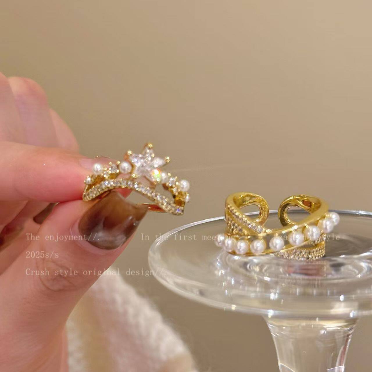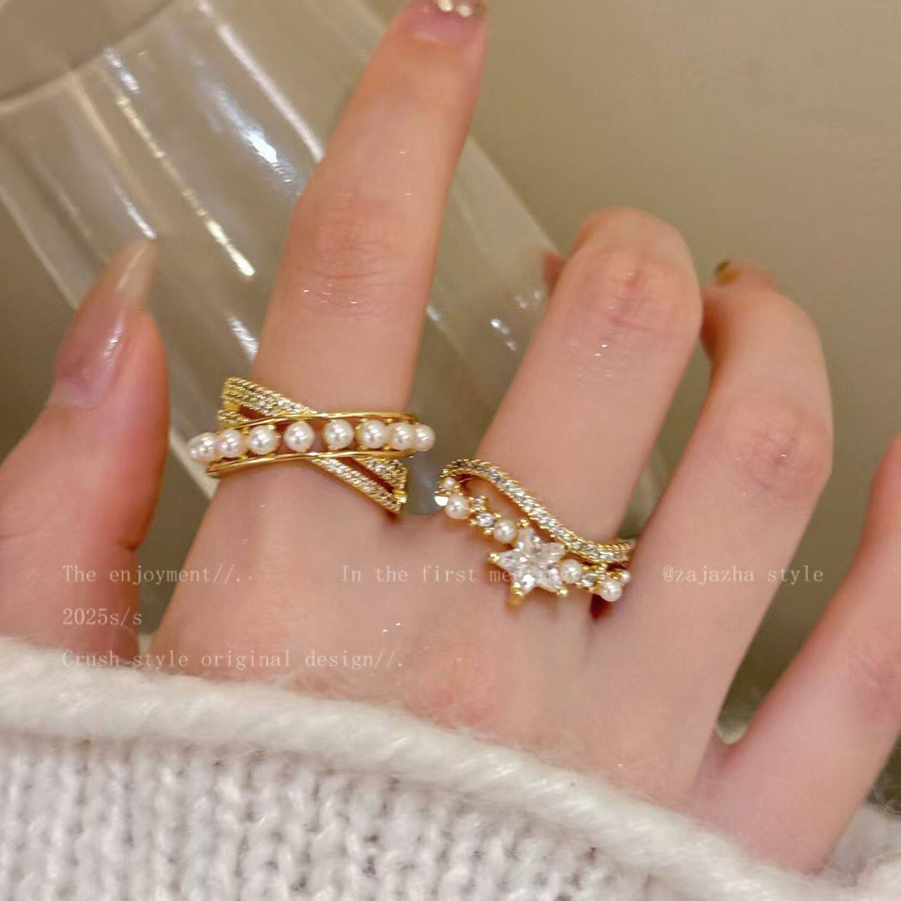 白昼流星~双层珍珠星星叠戴戒指女冬季轻奢高级感开口可调节指环