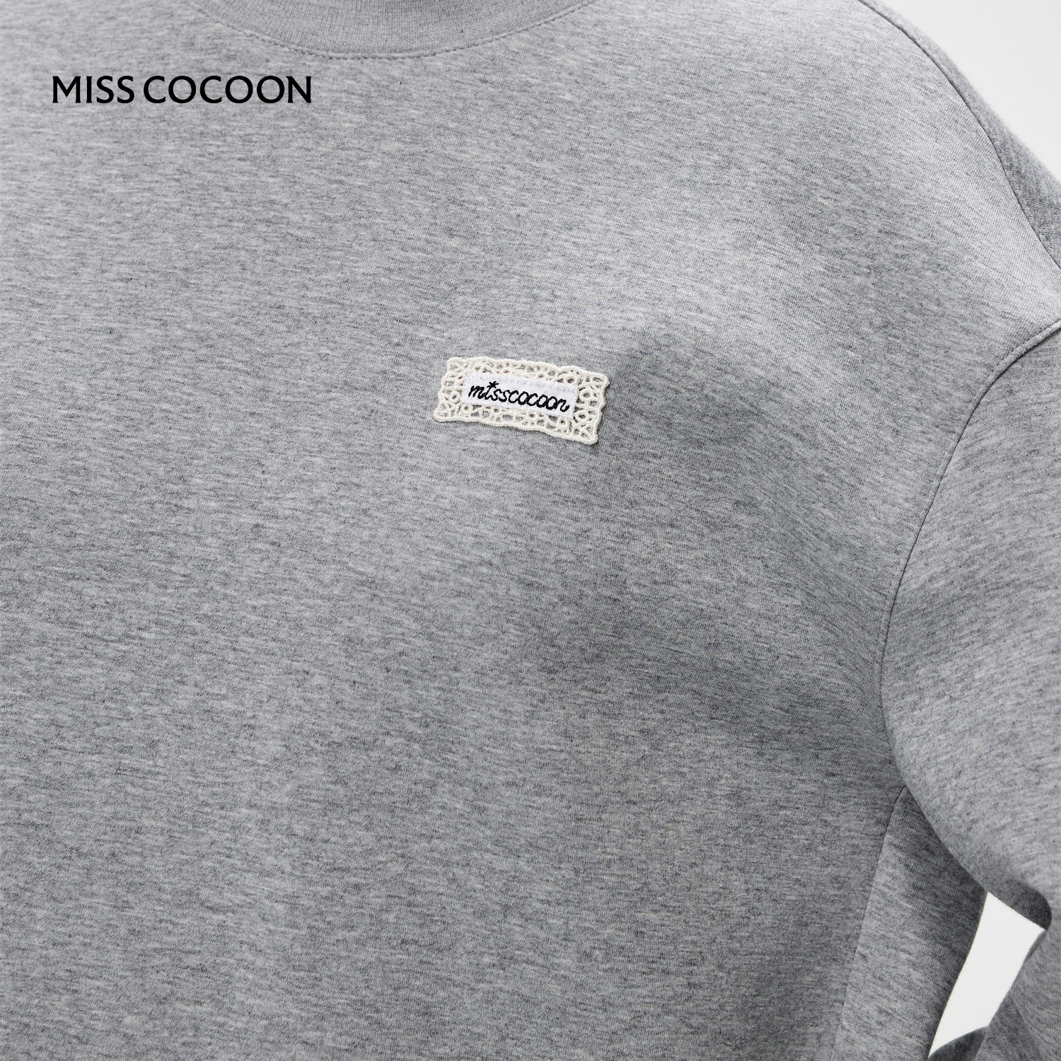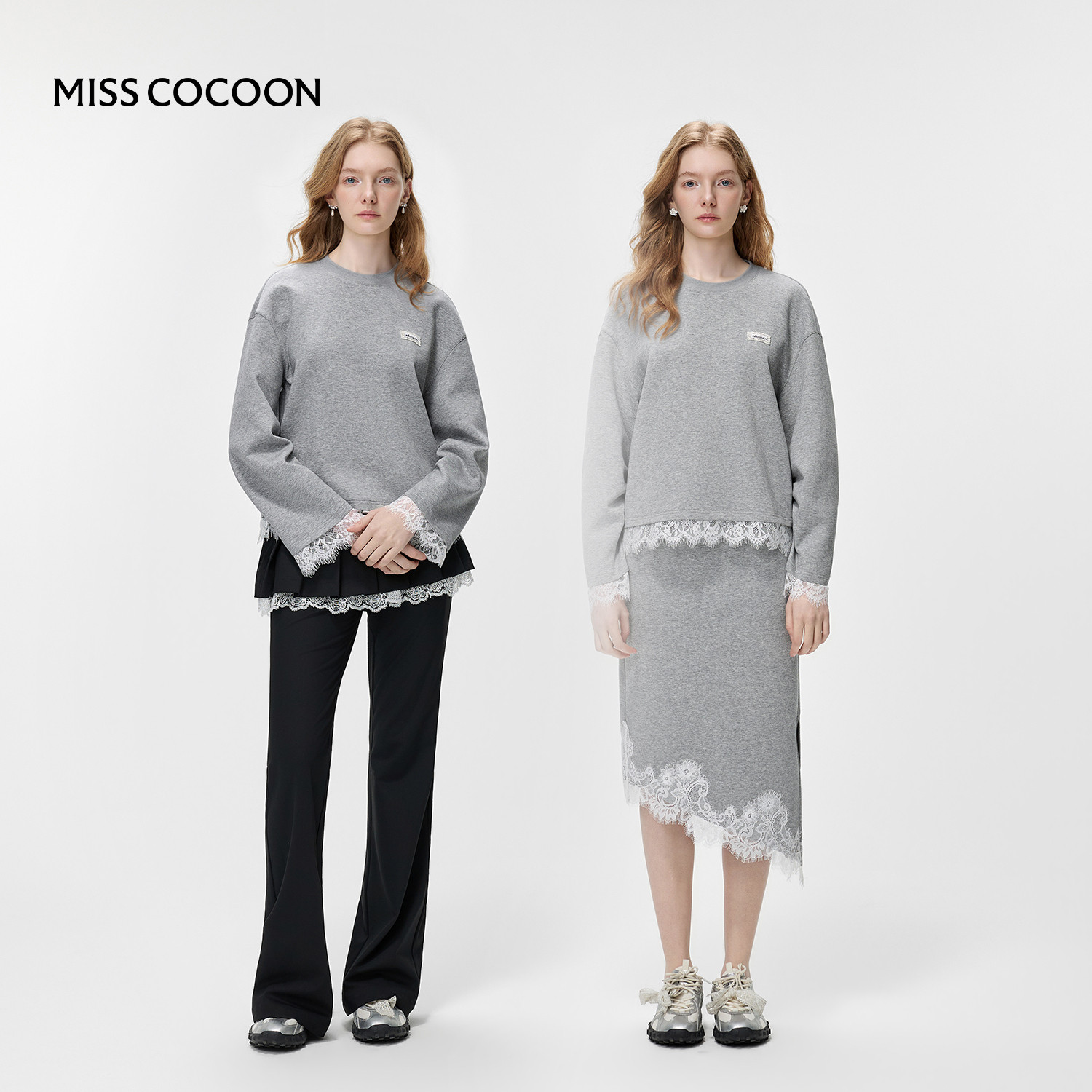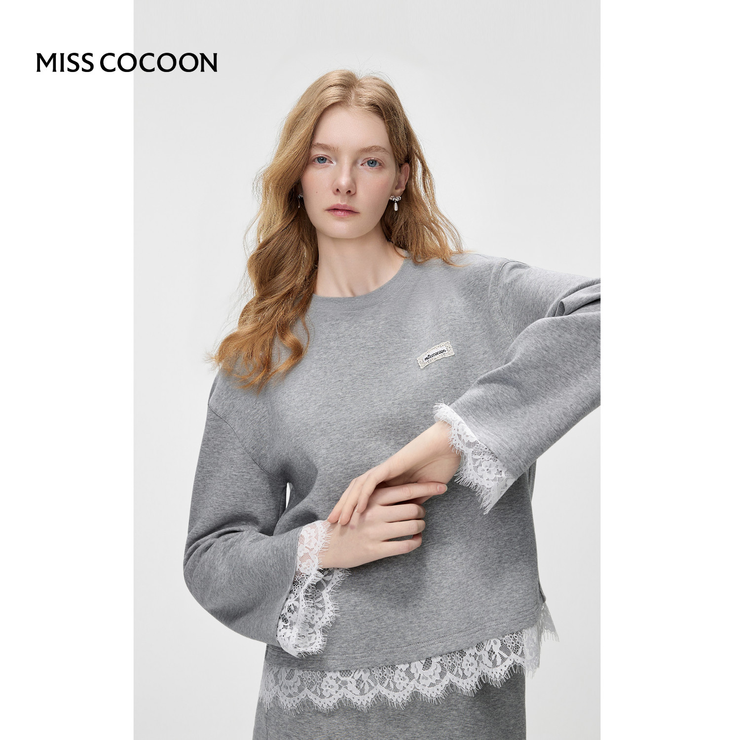 MISSCOCOON可可尼蕾丝拼接半身裙女2026春季新款灰色棉质休闲套装