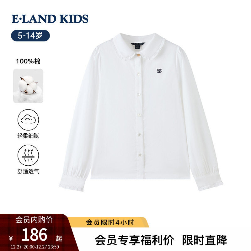 【100%棉】eland kids衣恋童装女童衬衫25年秋冬新品娃娃领学院风
