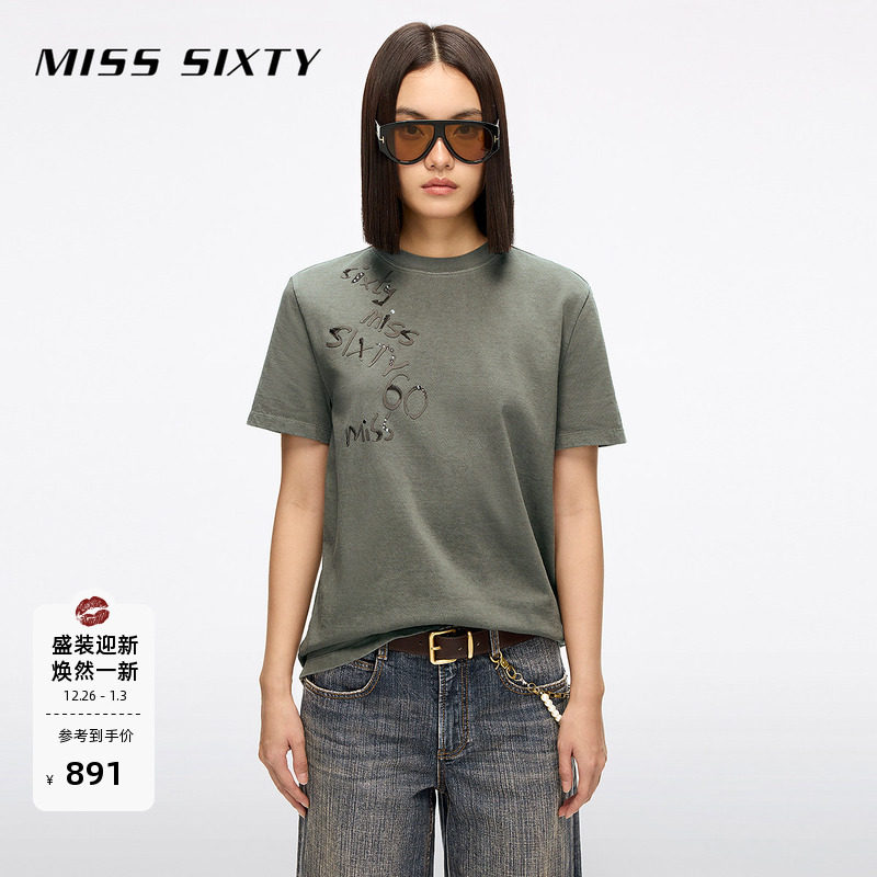 Miss Sixty2025冬季新款棉质短袖T恤女圆领烫钻拼贴刺绣设计上衣