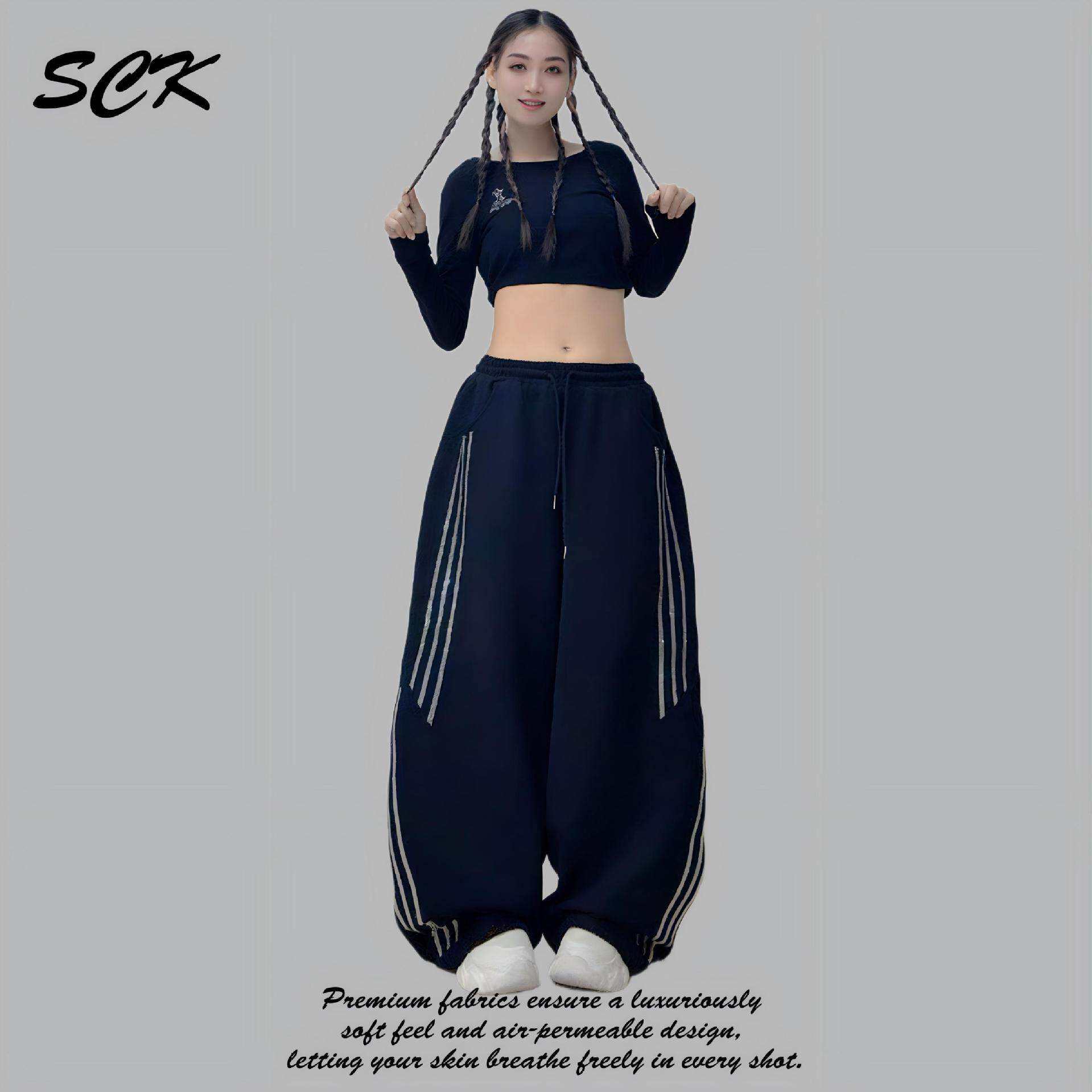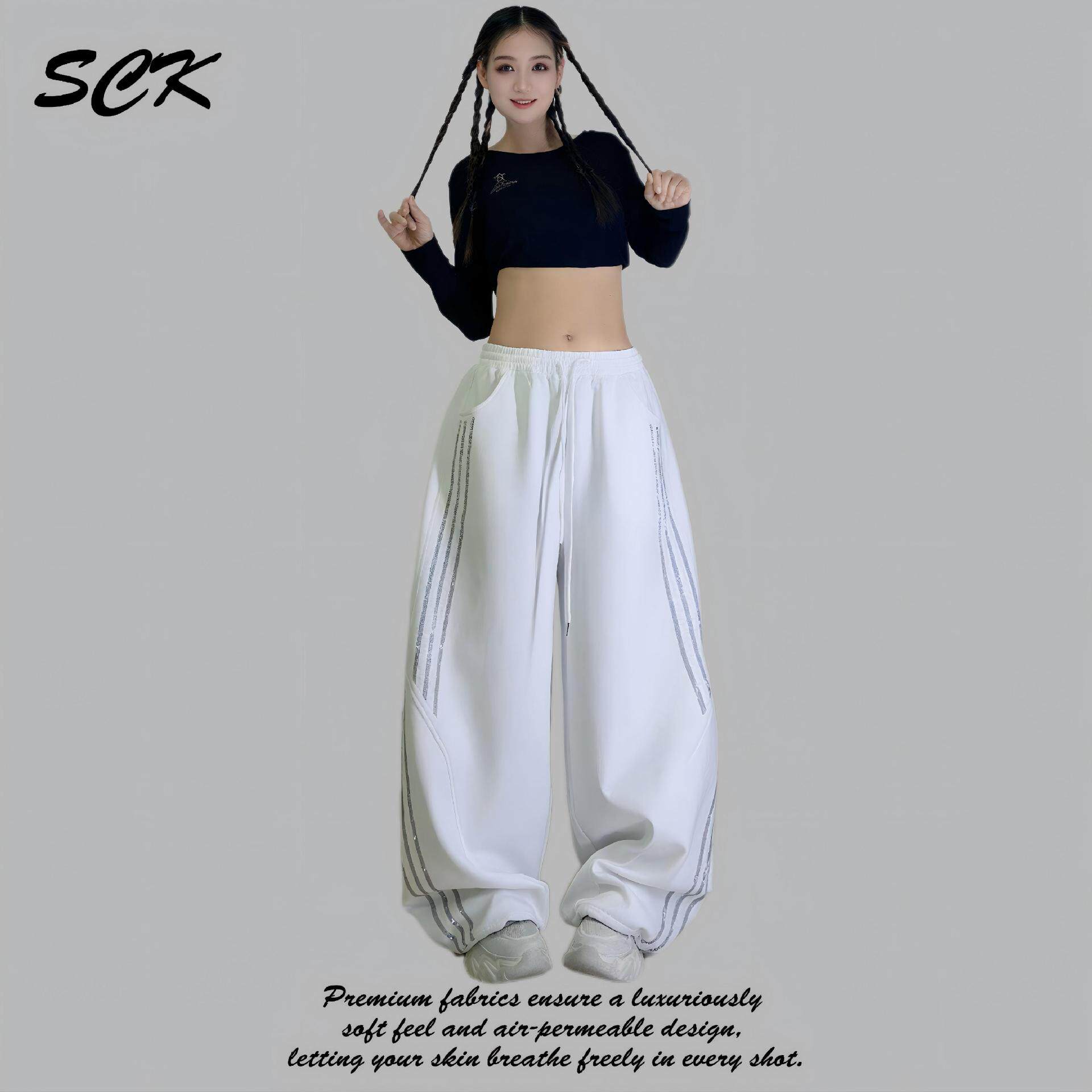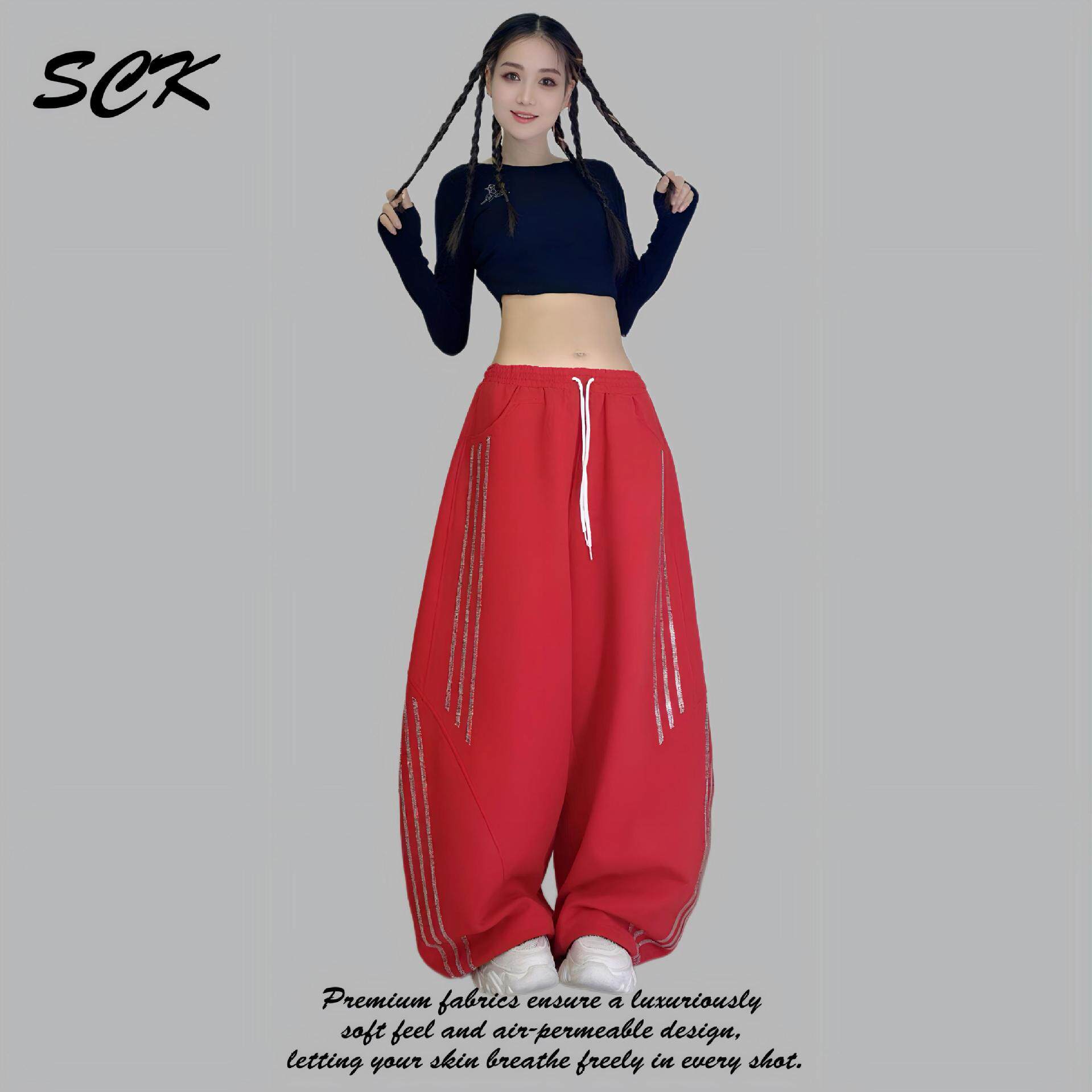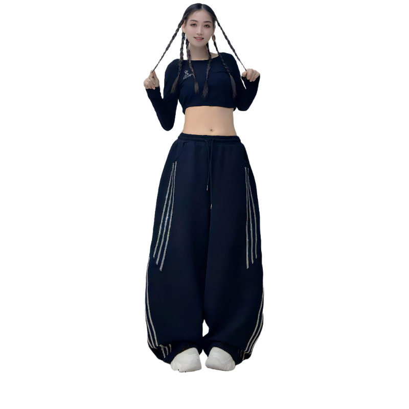 秋冬新款加厚广场舞长裤闪钻条纹烫钻宽松运动裤微弹爵士舞阔腿裤