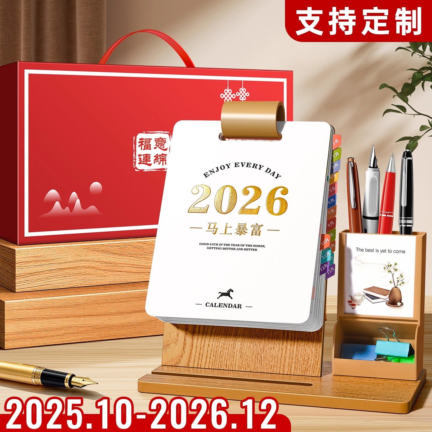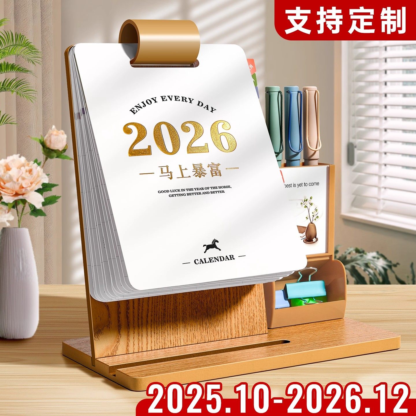木质台历日历2026年新款马年桌面摆件创意带笔筒商务办公室工作自律打卡计划本定制logo月历2025记事小台历本