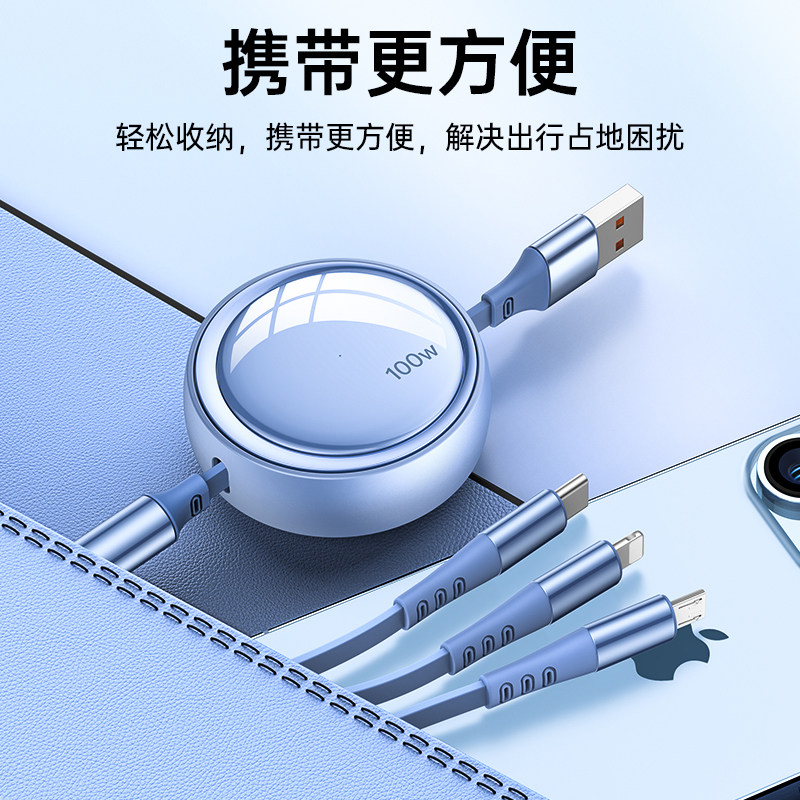【100W超级快充】三合一数据线伸缩一拖三充电器线三头适用苹果华为安卓Typec手机平板USB闪充车载多功能通用
