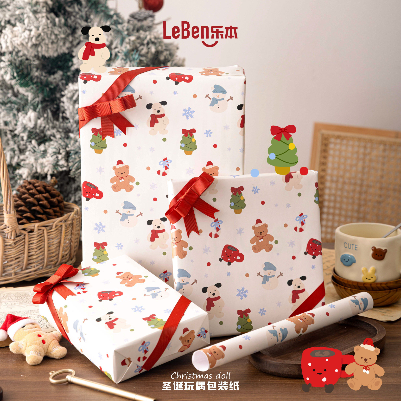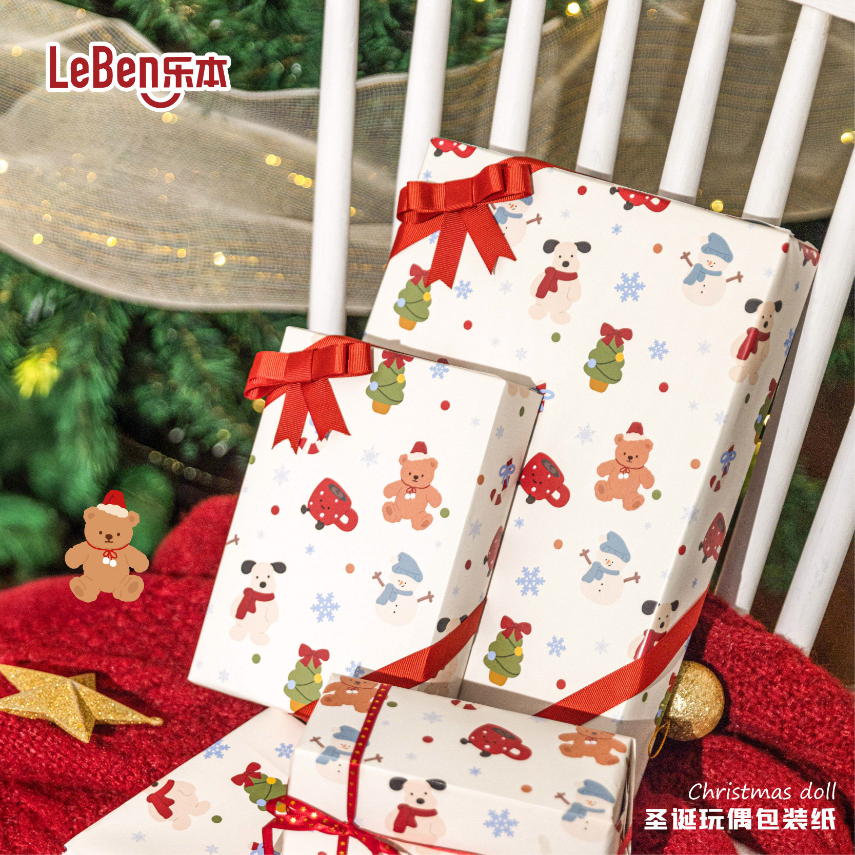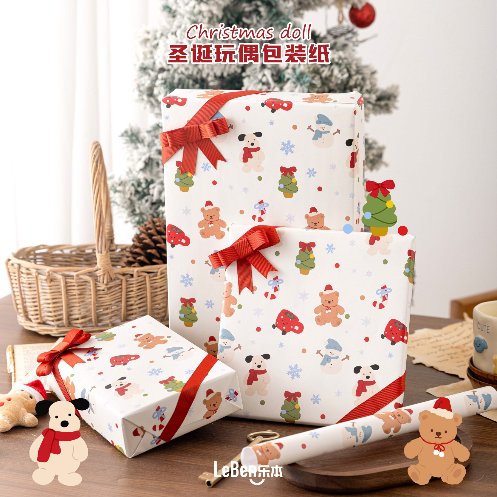 乐本·圣诞玩偶包装纸可爱打包纸礼物盒礼品纸鲜花花束纸ins生日礼盒纸手工diy包装材料可爱卡通大尺寸书皮纸