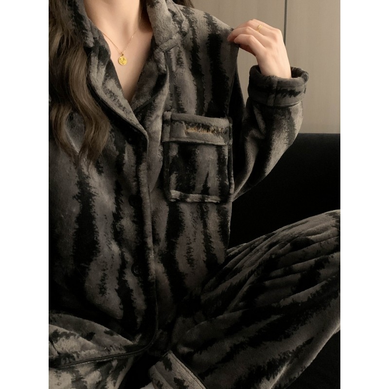 红豆日系轻奢条纹秋冬款情侣款睡衣男女加厚珊瑚绒保暖加绒家外出