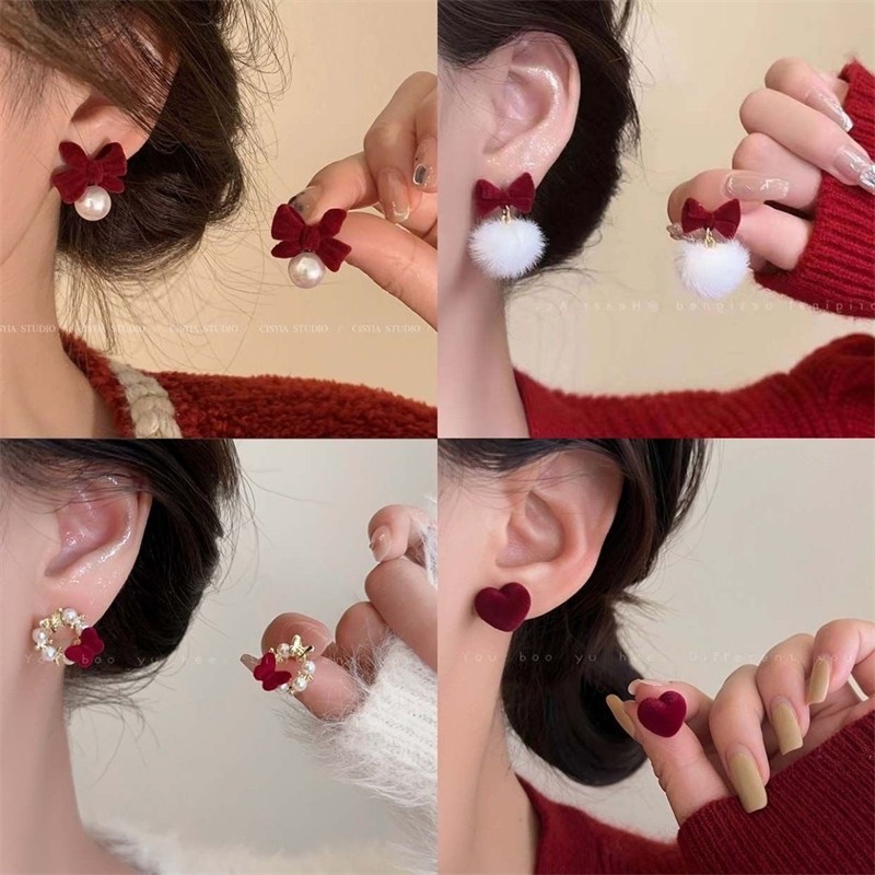 圣诞新年红色蝴蝶结珍珠耳环女耳夹小众高级感新款轻奢耳钉秋冬款